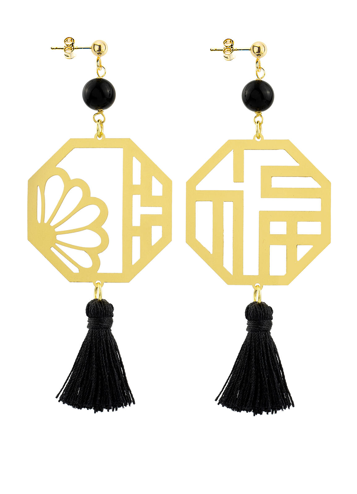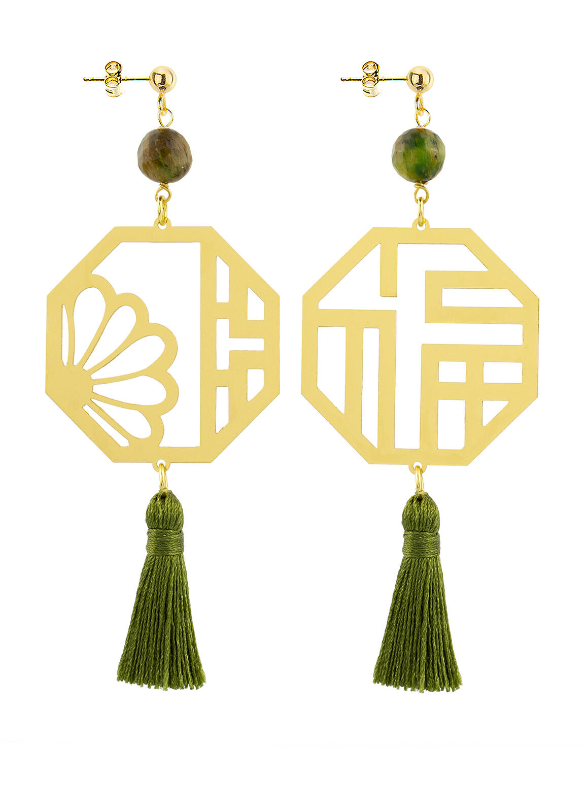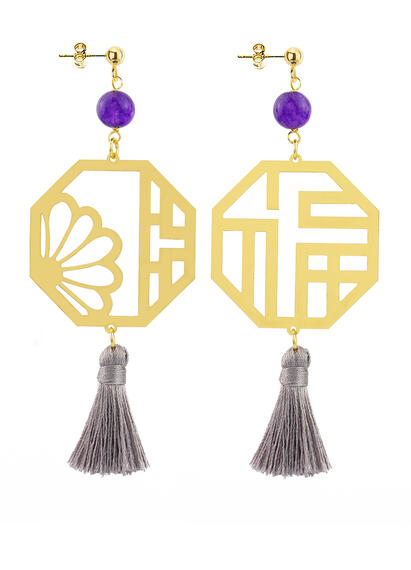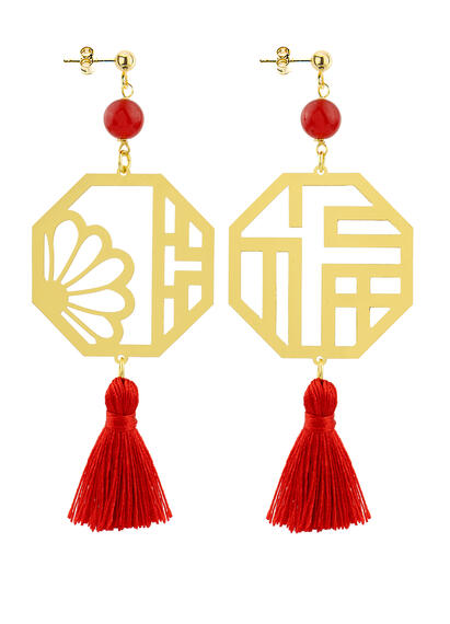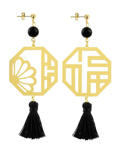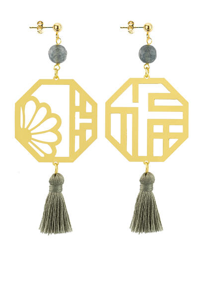 Kanji Lu Prosperity earrings in gold-plated brass, elements and natural stones. Length 9 cm. Pin and butterfly closure. Made in Italy.