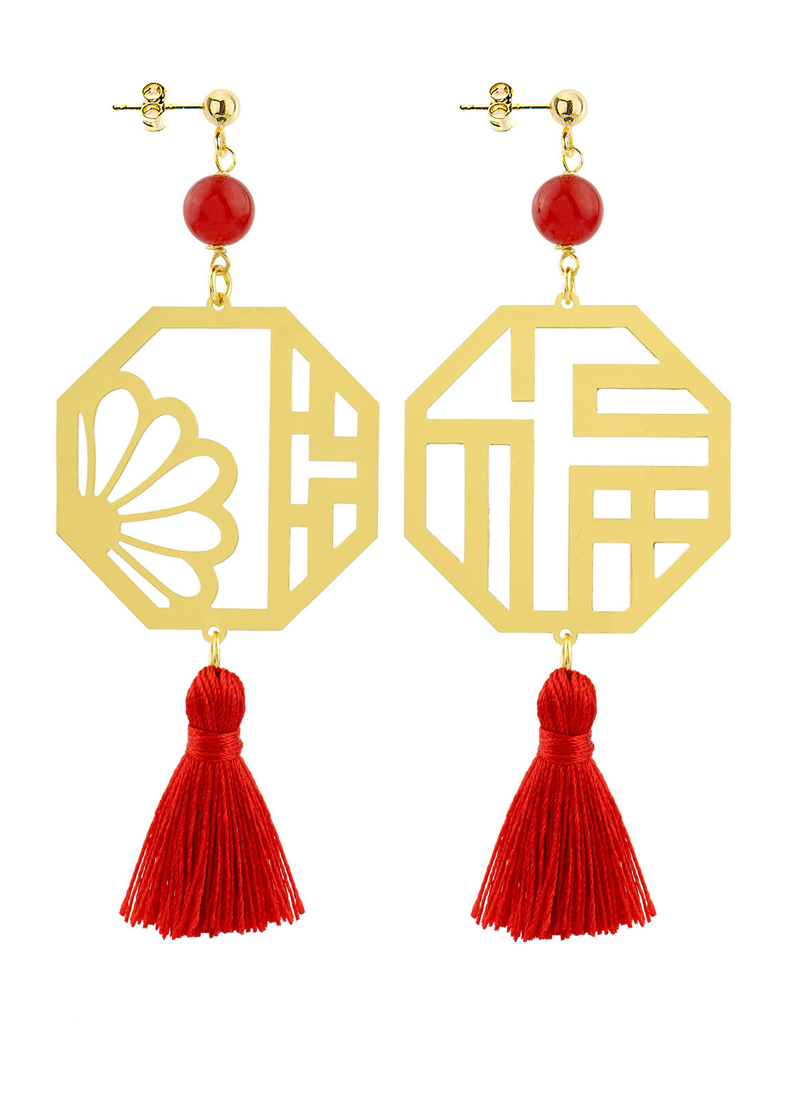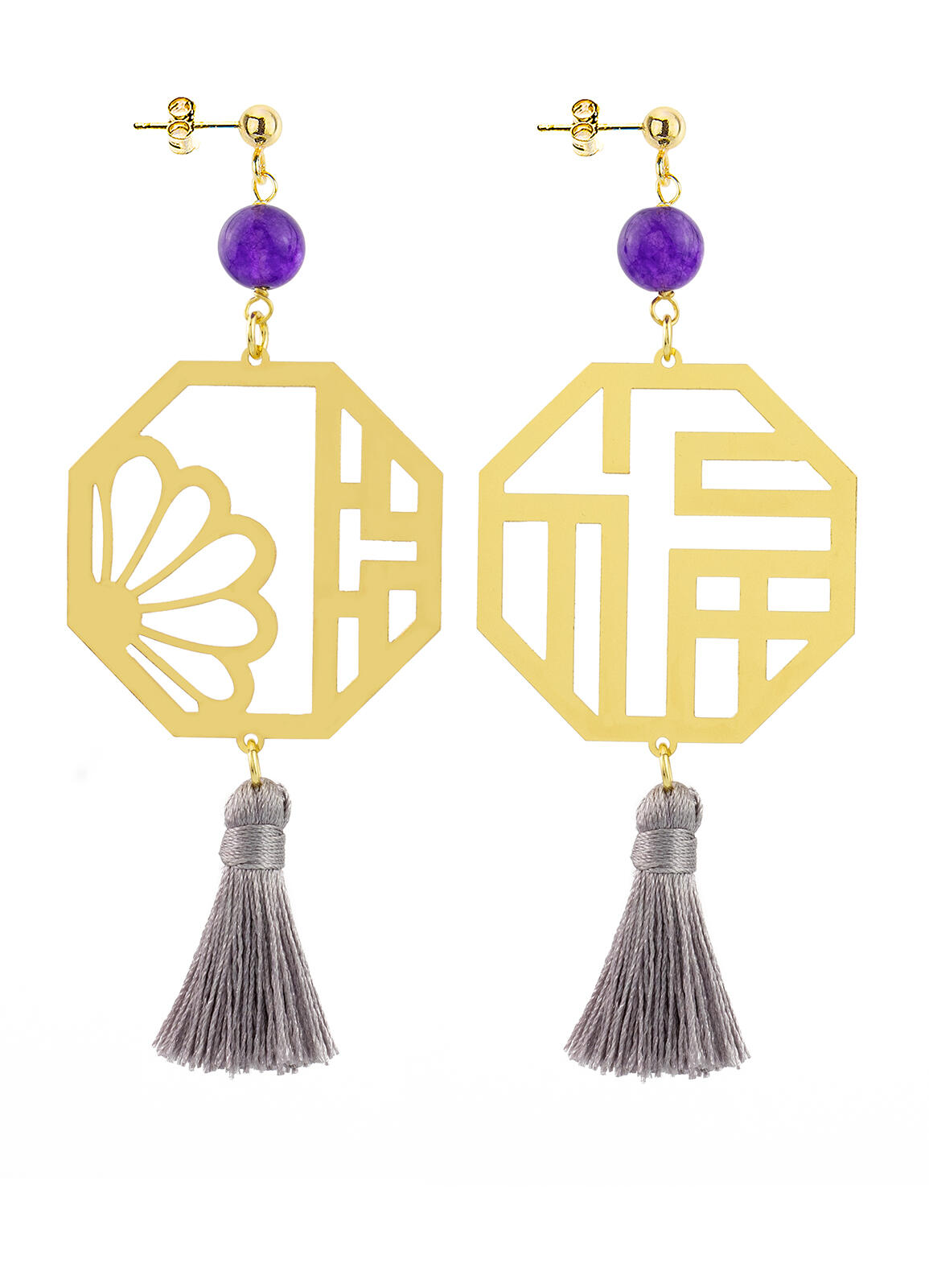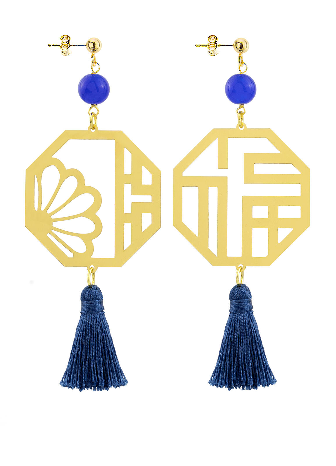 Kanji Lu Prosperity earrings in gold-plated brass, elements and natural stones. Length 9 cm. Pin and butterfly closure. Made in Italy.