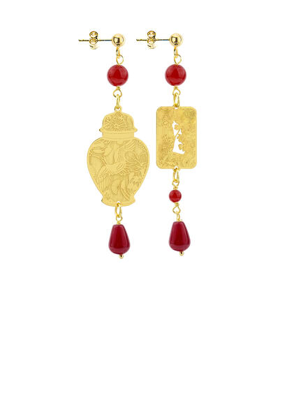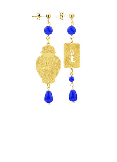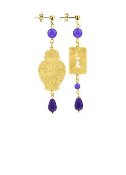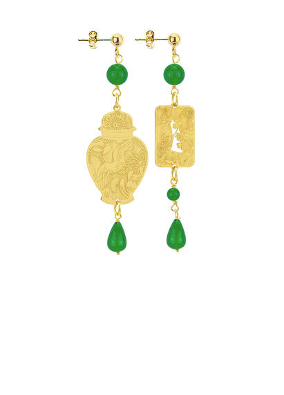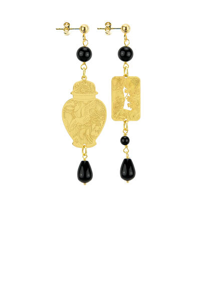 Orecchini in ottone galvanizzato oro, elementi e pietre naturali. Lunghezza 7 cm. Chiusura perno e farfalla. Made in Italy.