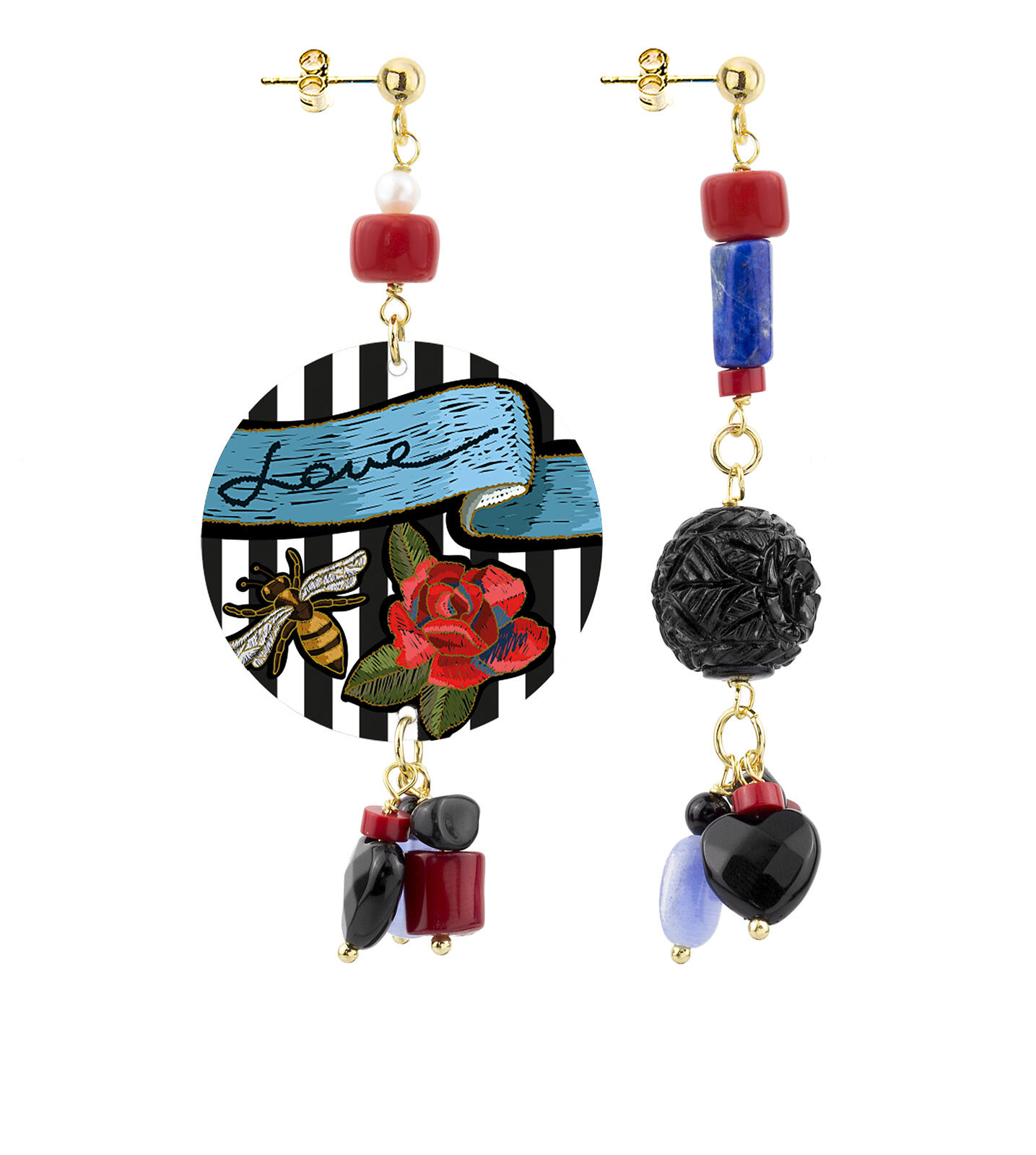 Earrings composed of a flat printed capsule and resins. Elements in brass galvanized gold and natural stones. Length 8 cm. Diameter 3.5cm. Made in Italy