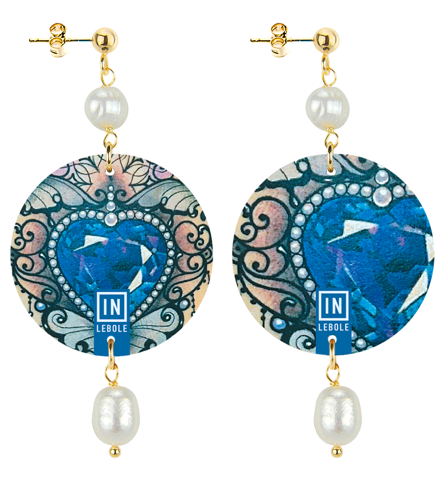 The earrings from Lebole Maison's The Circle collection are made with flat capsules printed on tinplate, mounted in gold-plated brass and natural stones. The asymmetry is given by the different images imprinted on the capsule.