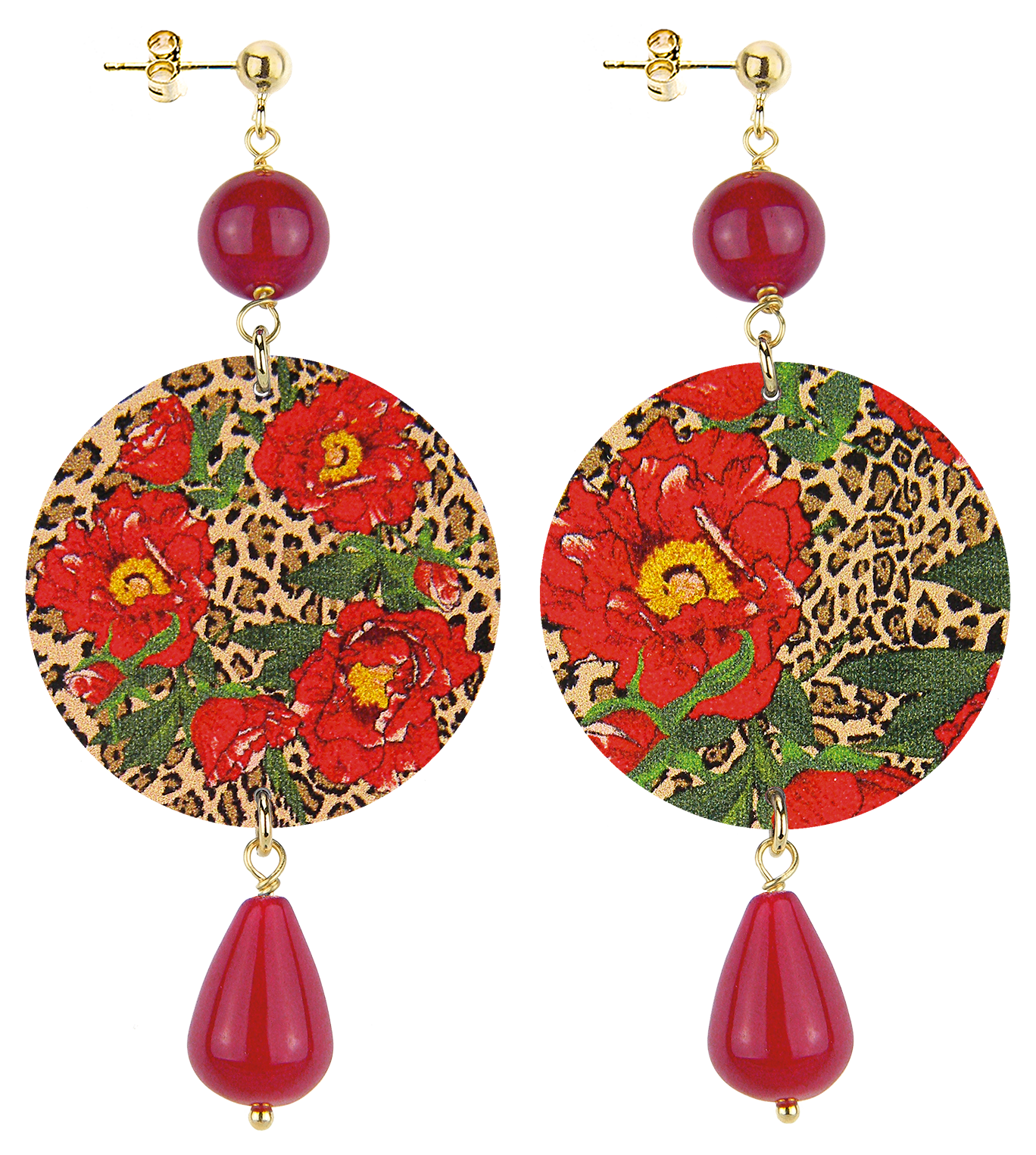 Earrings composed of a flat printed capsule. Elements in brass galvanized gold and natural stones. Length 8.5 cm. Diameter 3.5cm. Made in Italy