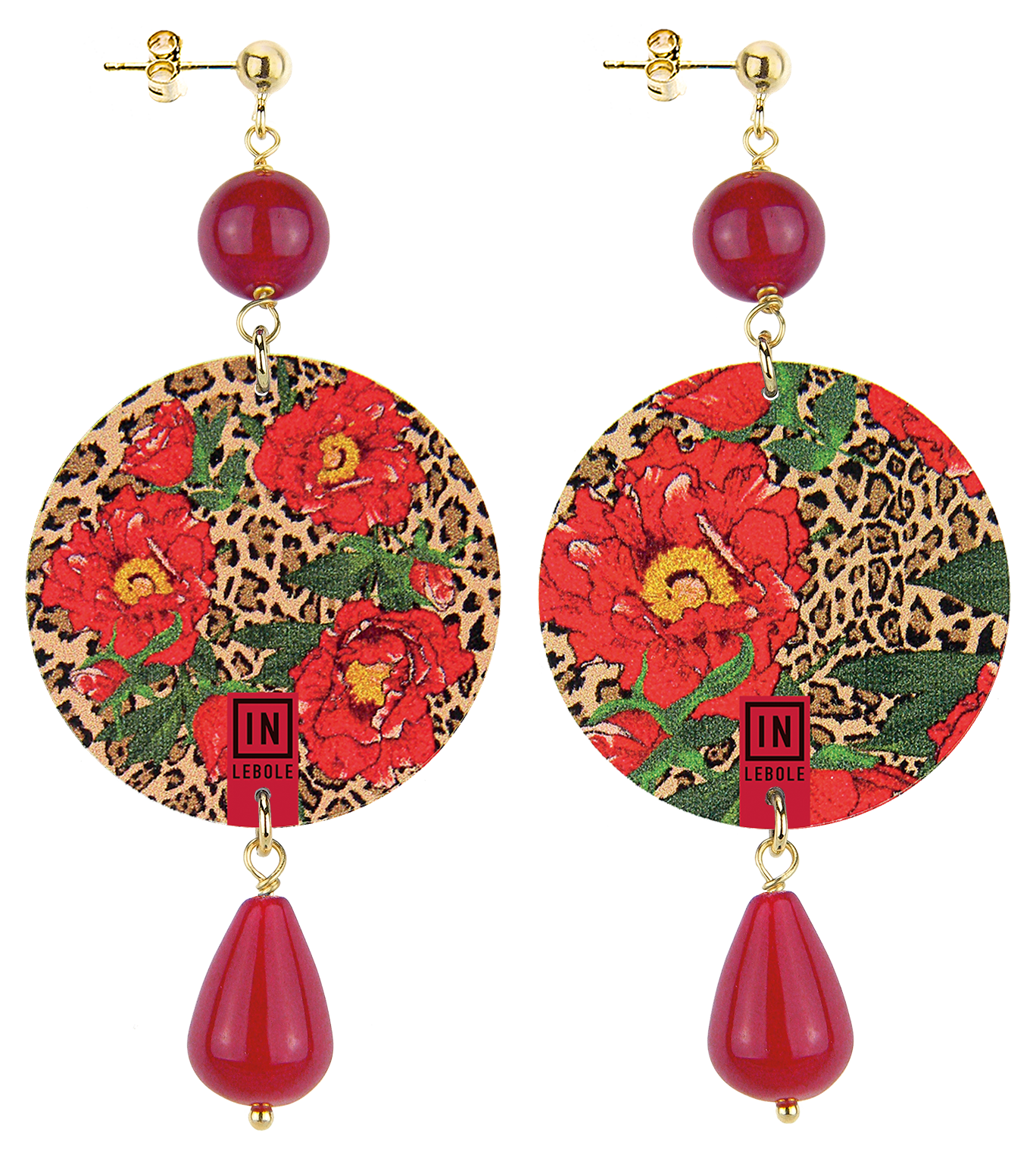 The earrings from Lebole Maison's The Circle collection are made with flat capsules printed on tinplate, mounted in gold-plated brass and natural stones. The asymmetry is given by the different images imprinted on the capsule.
