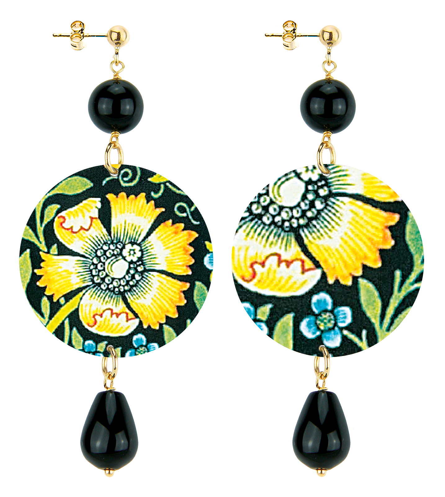 Earrings composed of a flat printed capsule. Elements in brass galvanized gold and natural stones. Length 8,5 cm. Diameter 3.5 cm. Made in Italy