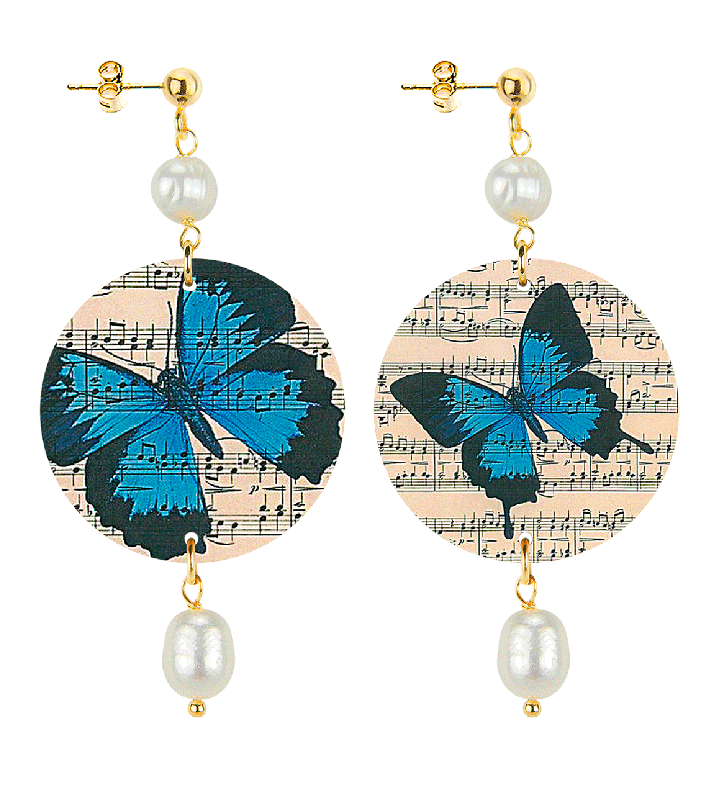 The earrings from Lebole Maison's The Circle collection are made with flat capsules printed on tinplate, mounted in gold-plated brass and natural stones. The asymmetry is given by the different images imprinted on the capsule.