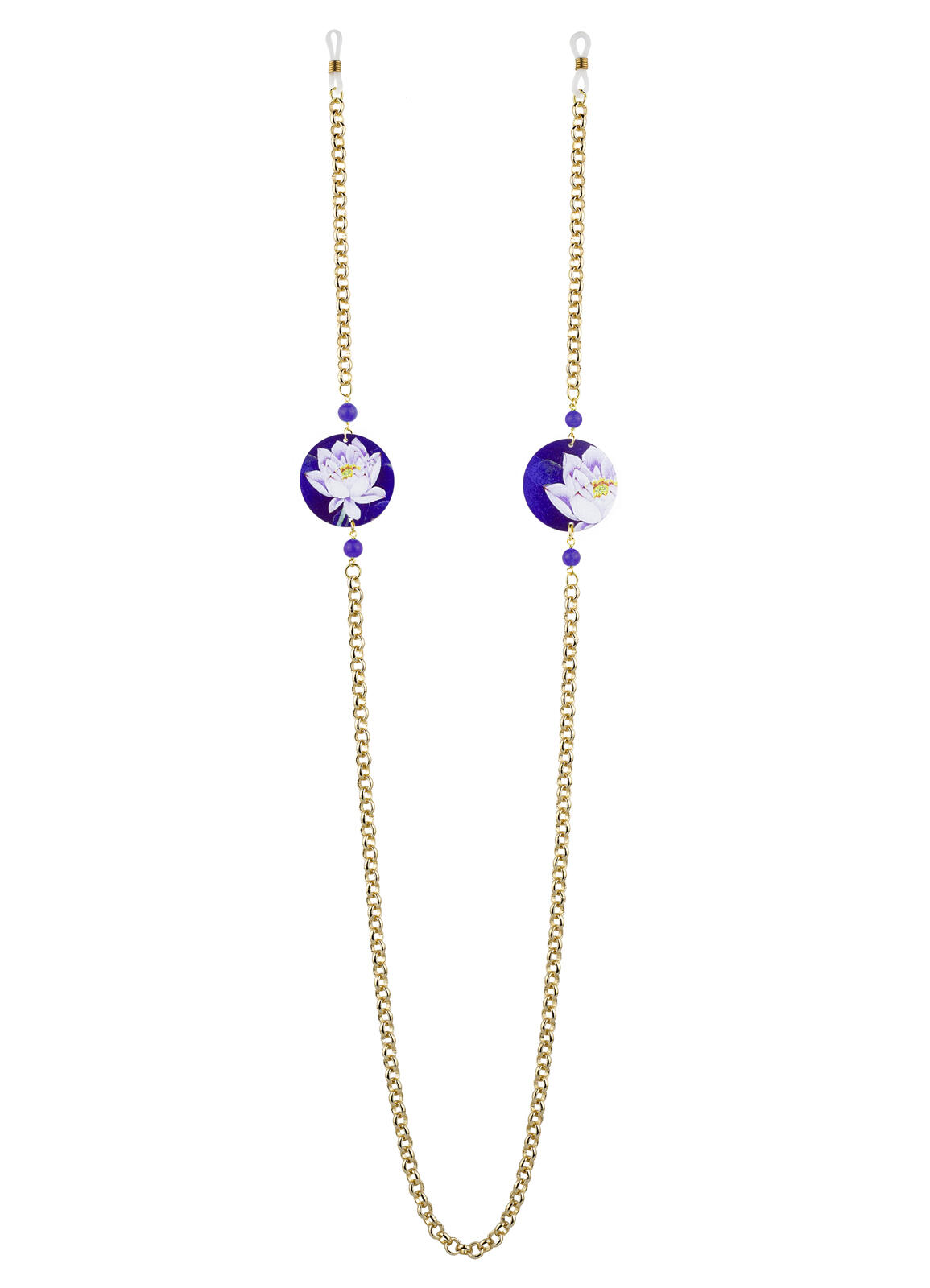 Accessorio porta occhiali con catena in ottone bagnato oro ed elementi della collezione The Circle. Lunghezza catena 85 cm. Lunghezza elemento 3 cm. Taglia Unica. Made in Italy
