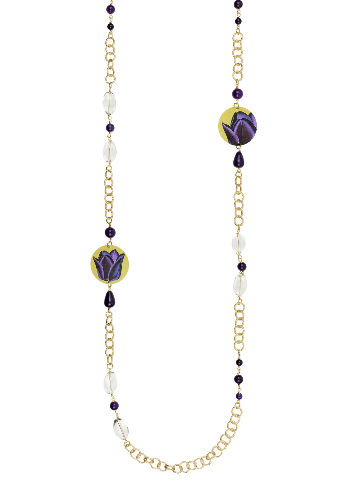 Necklace with The Circe capsule and natural stones. Gold galvanized brass chain measuring 110 cm. Pendant length 8.5cm. Made in Italy