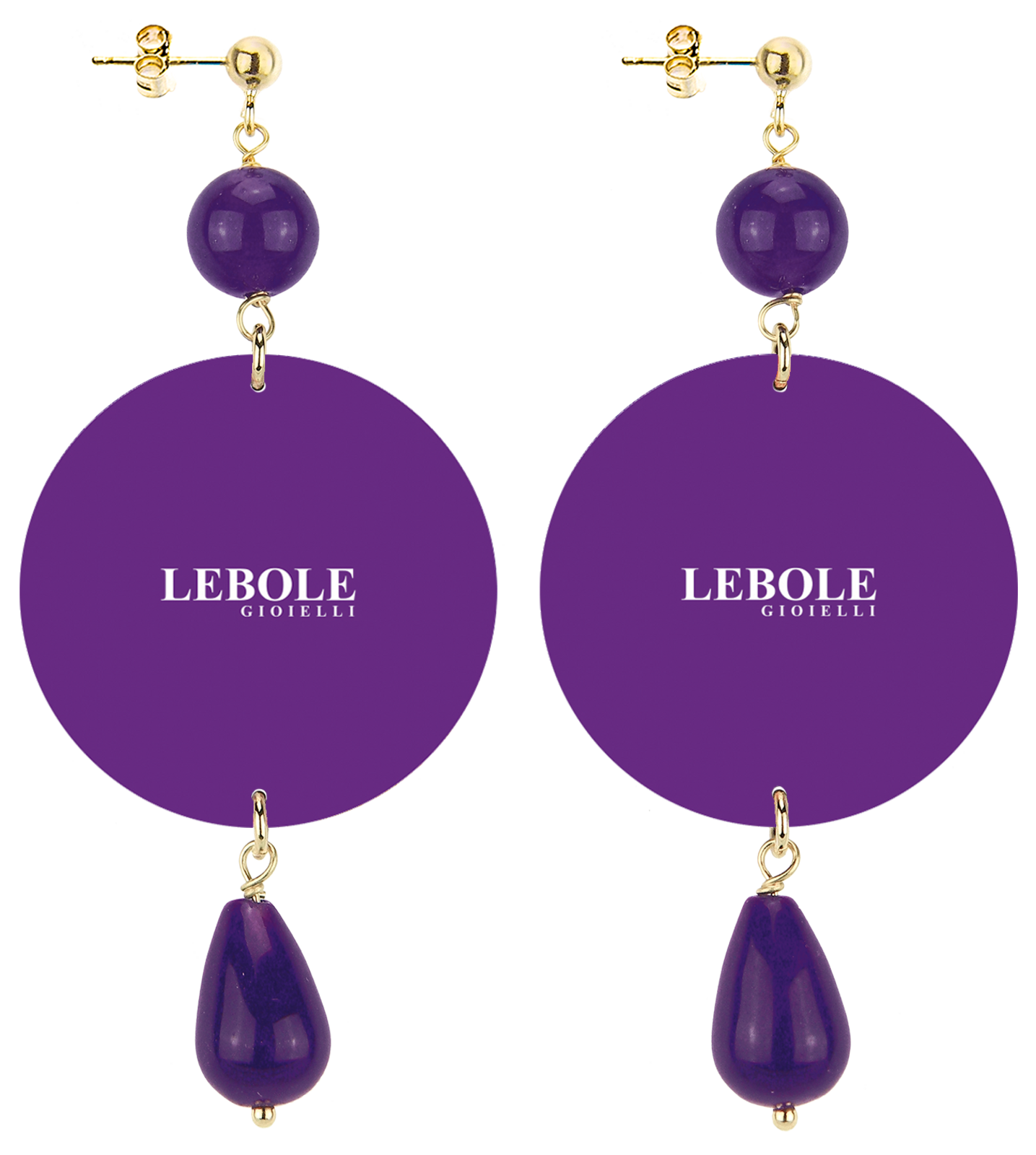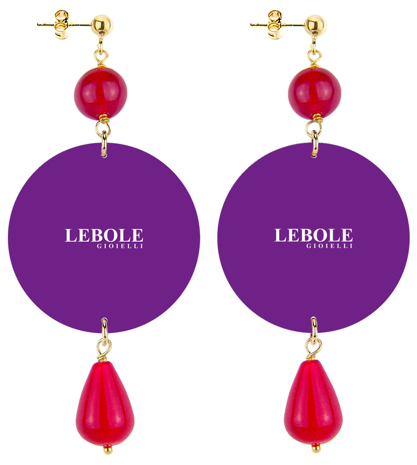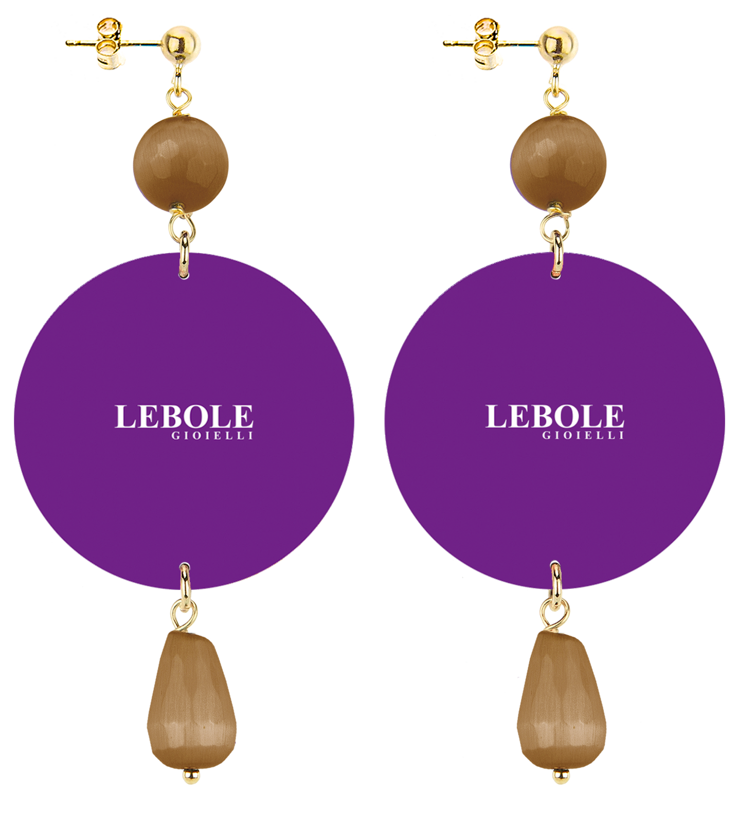 The earrings from Lebole Maison's The Circle collection are made with flat capsules printed on tinplate, mounted in gold-plated brass and natural stones. The asymmetry is given by the different images imprinted on the capsule.