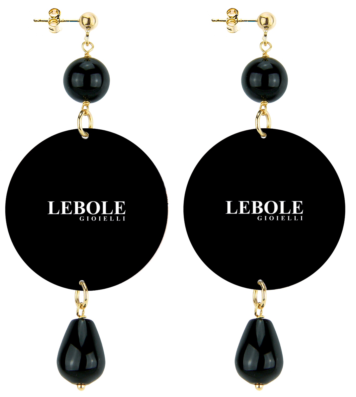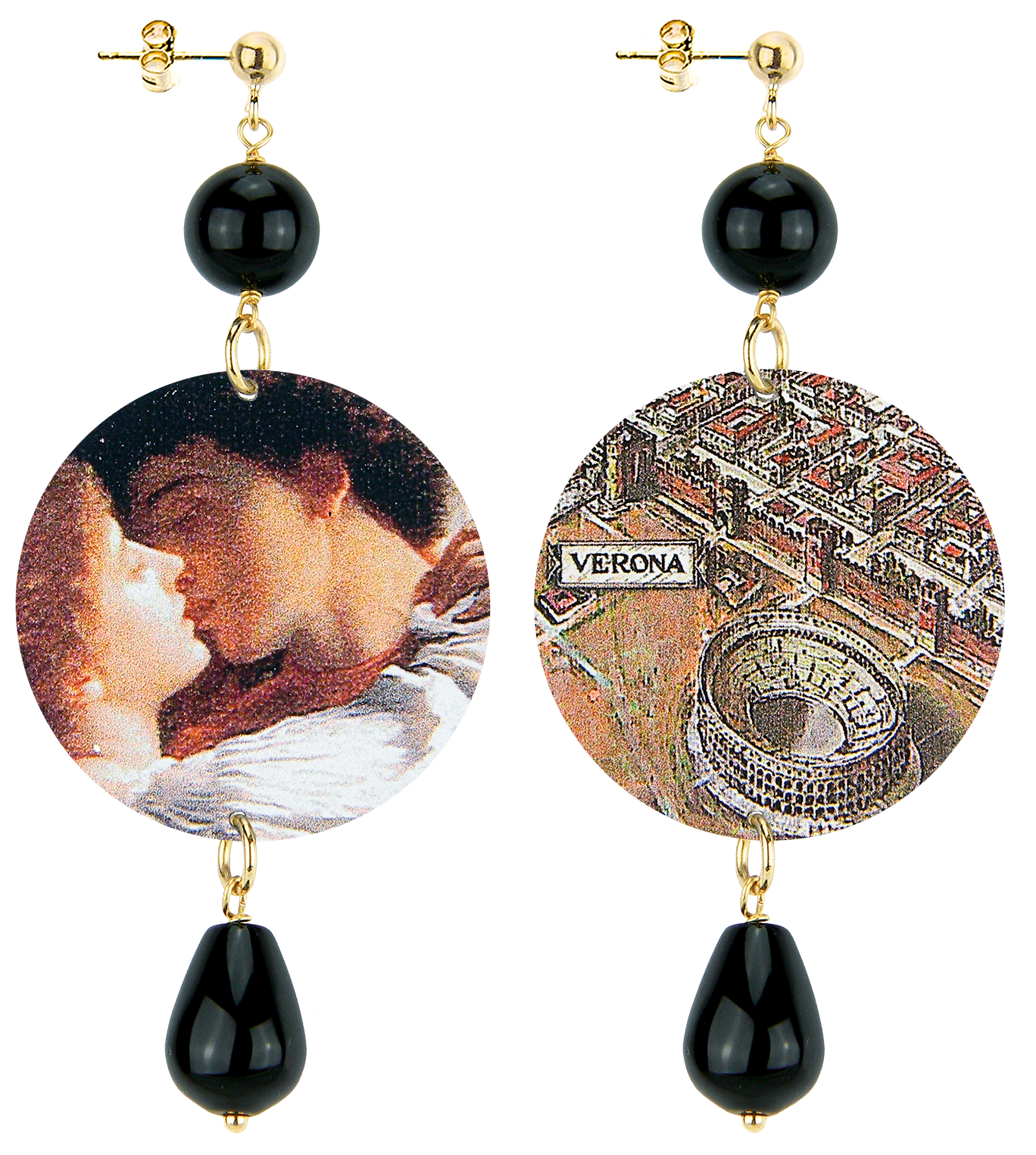 The earrings from Lebole Maison's The Circle collection are made with flat capsules printed on tinplate, mounted in gold-plated brass and natural stones. The asymmetry is given by the different images imprinted on the capsule.