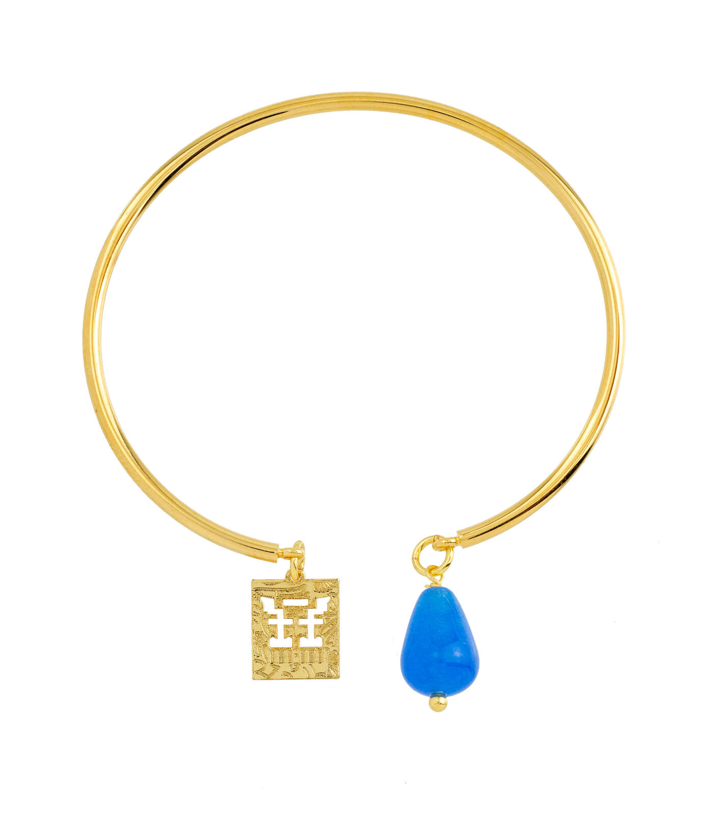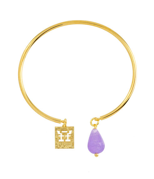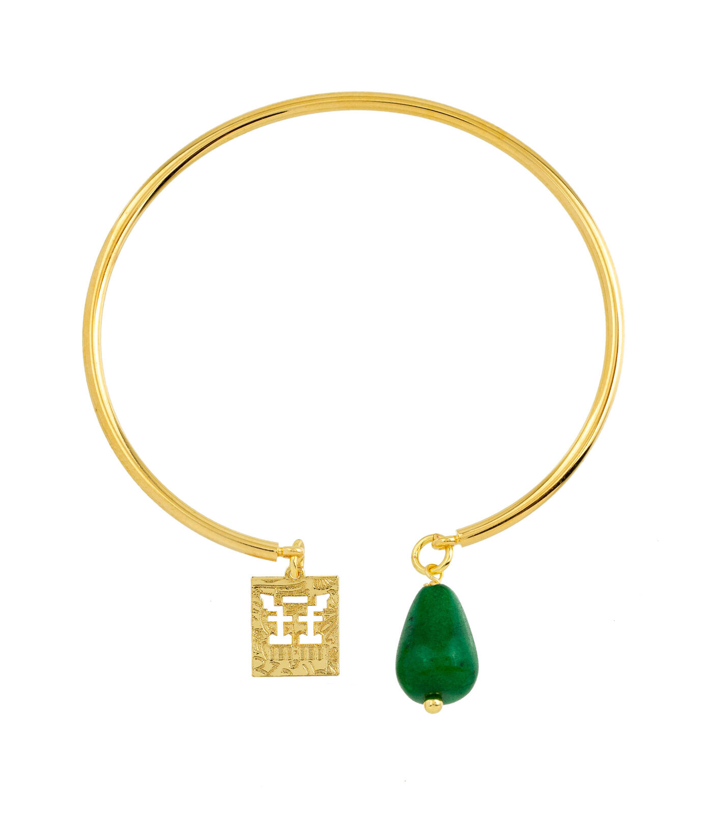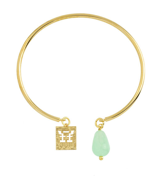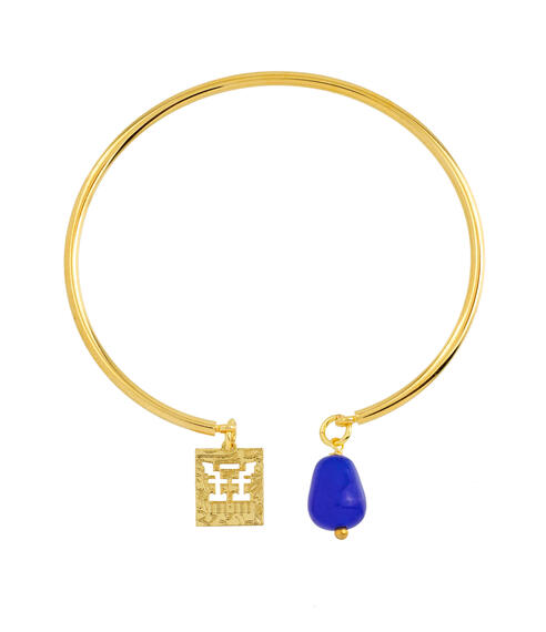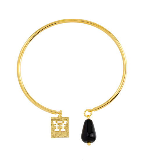 Rigid bracelet in gold-plated brass. Element in gold-plated brass and natural stones. Diameter 6 cm. Pendant length 2 cm. Made in Italy.