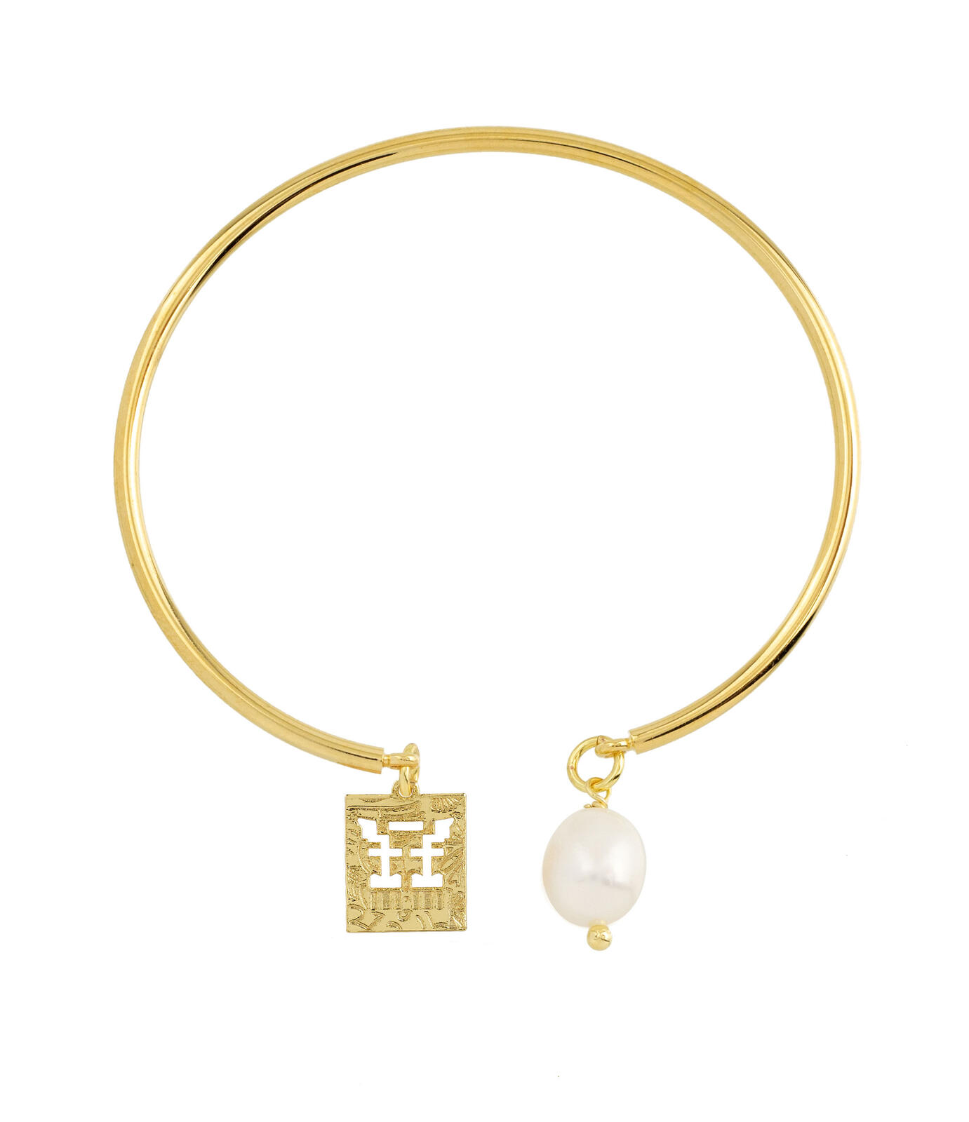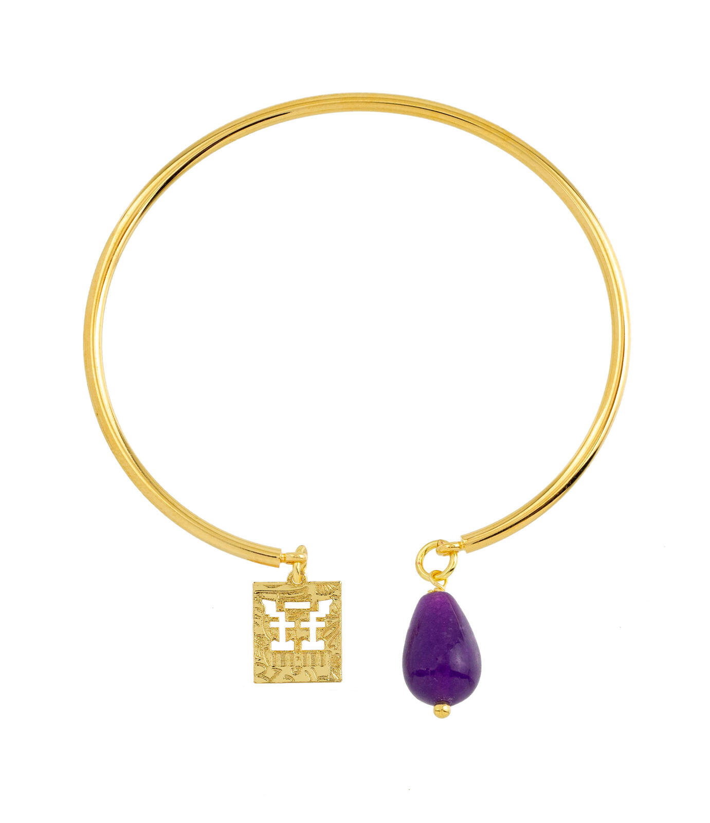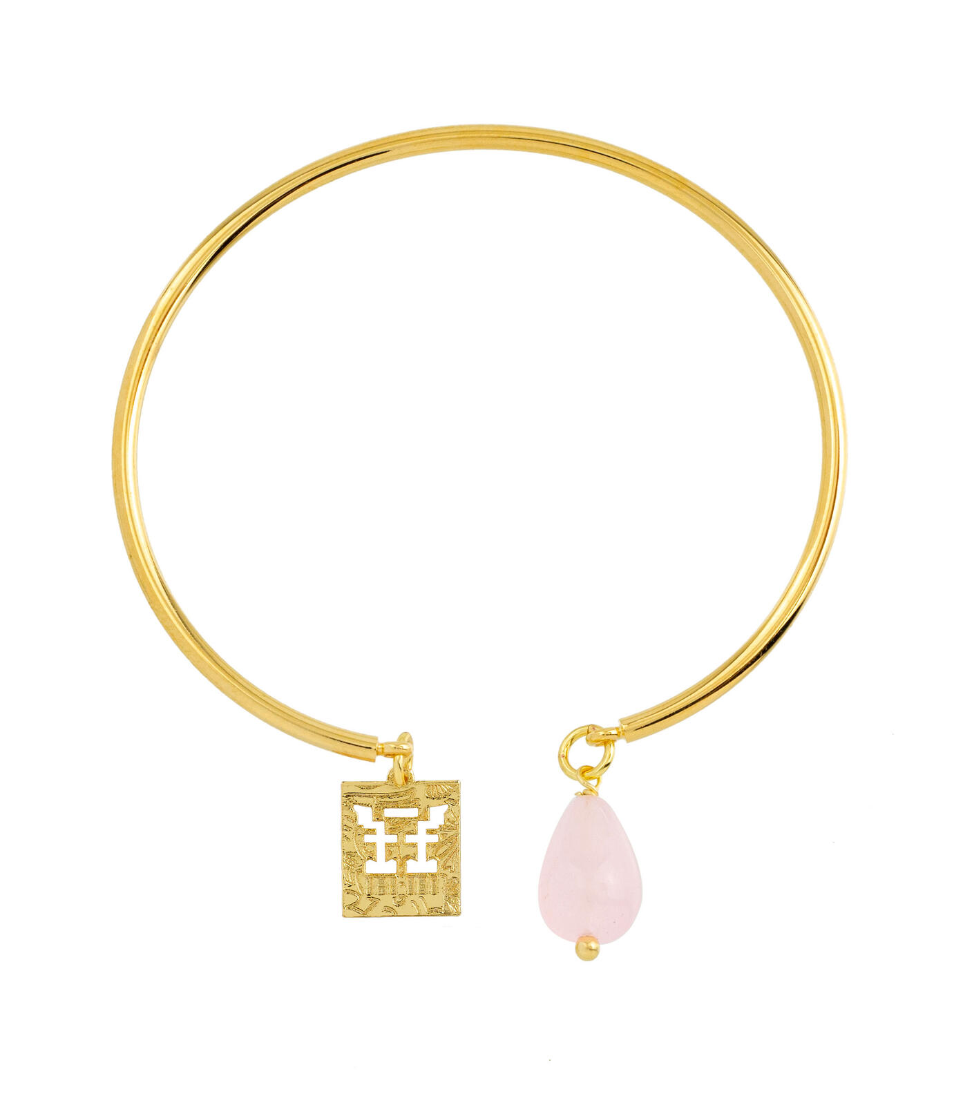 Rigid bracelet in gold-plated brass. Element in gold-plated brass and natural stones. Diameter 6 cm. Pendant length 2 cm. Made in Italy.