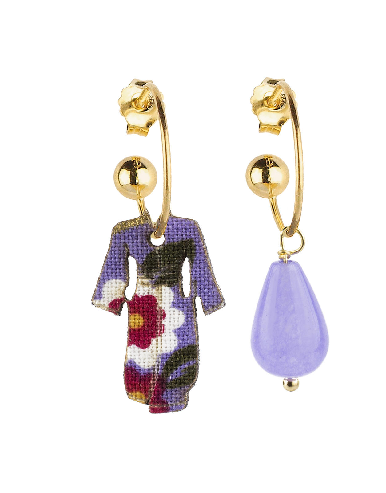 Gold galvanized brass earrings, kimono fabrics laid on a wood core and natural stones. Length 4 cm. Pin and butterfly closure. Made in Italy