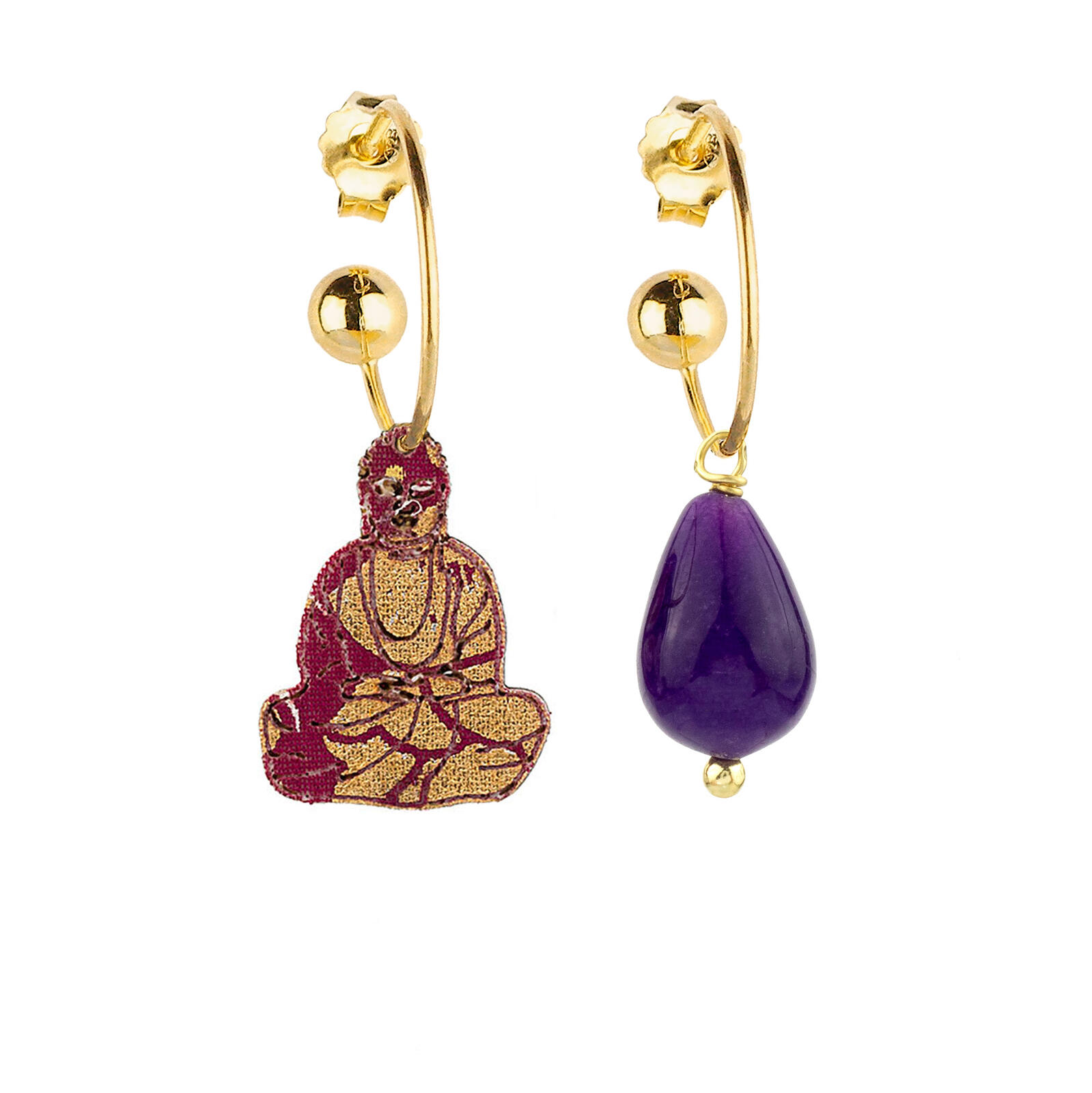 Orecchini in tessuto di kimono steso su un'anima di legno, ottone galvanizzato oro e pietre naturali. Lunghezza 2 cm. Chiusura perno e farfallina. Made in Italy