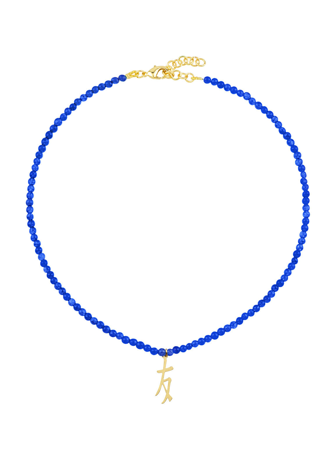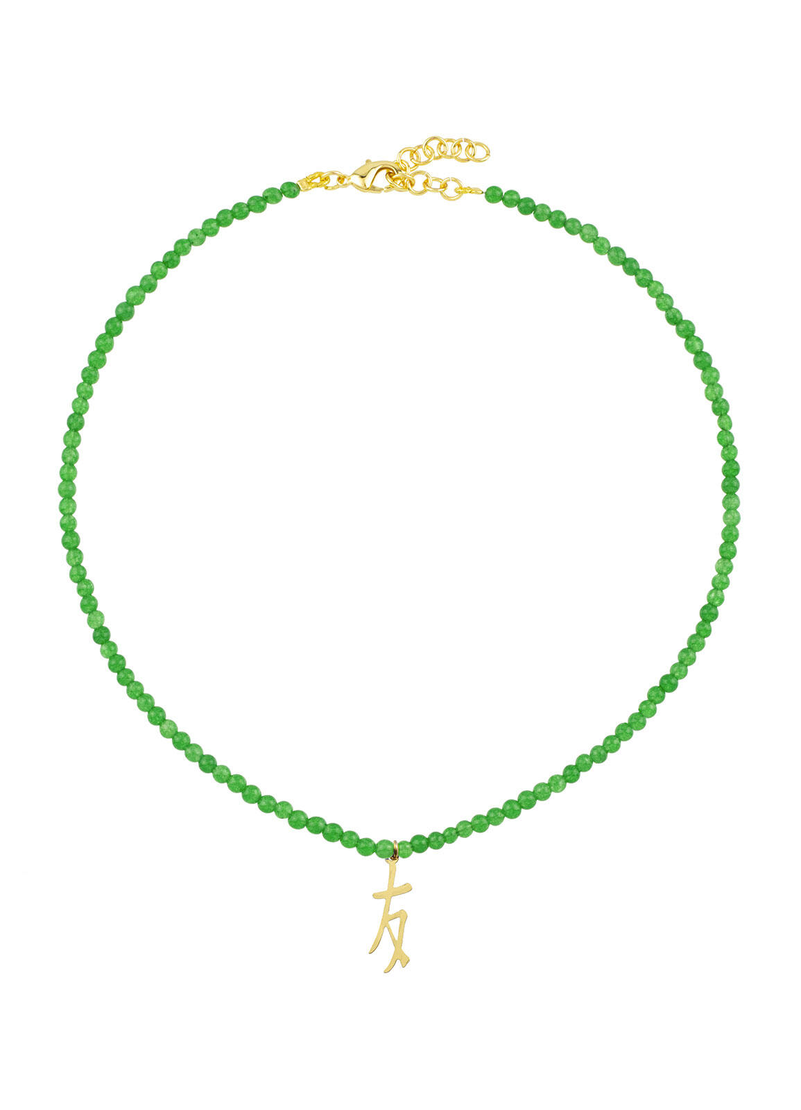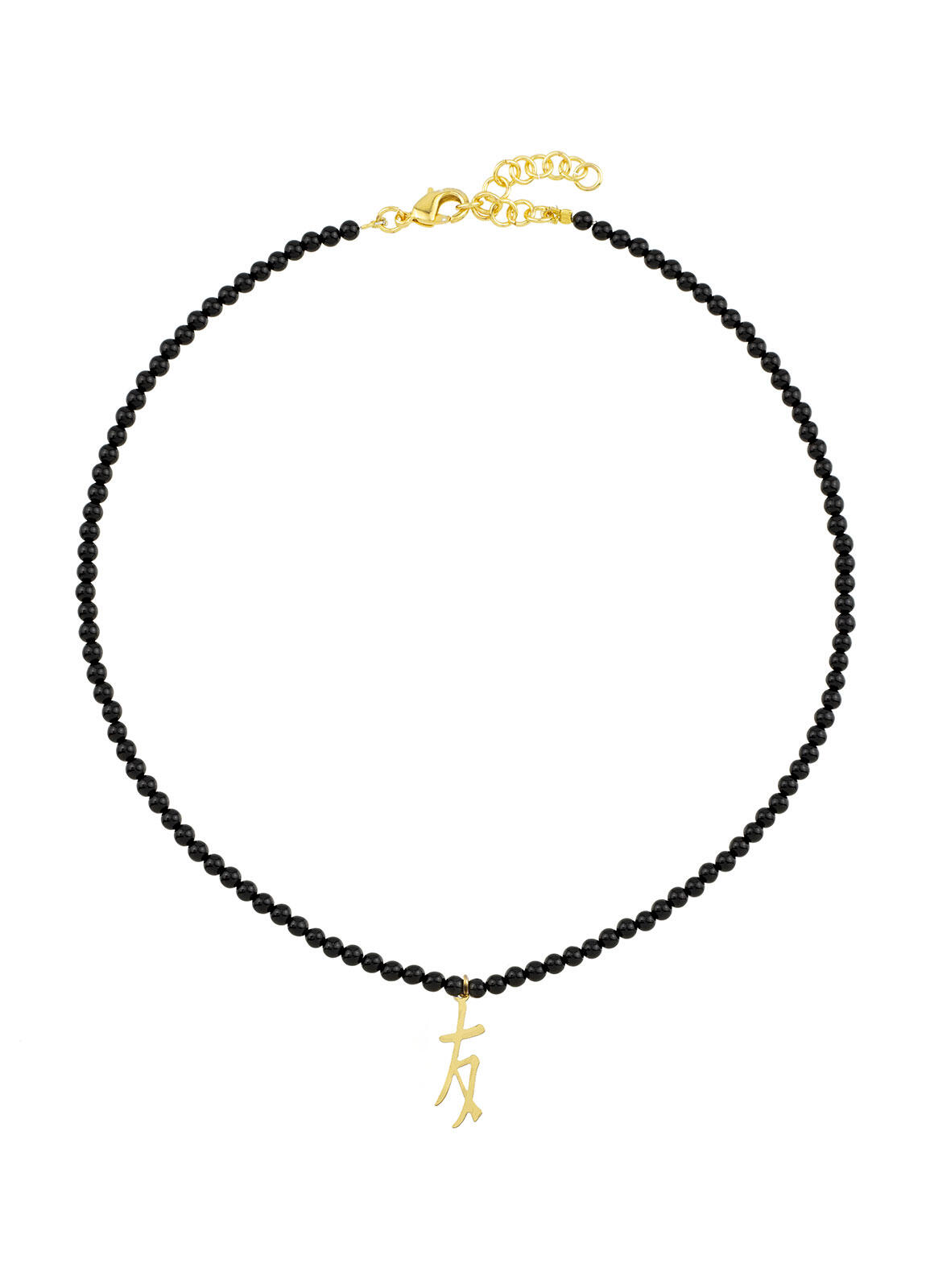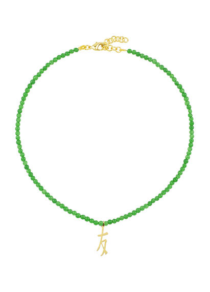 Necklace in natural colored stones, Kanji Friendship in gold-plated brass. Chain length 40 cm. Pendant length 2 cm. Made in Italy.