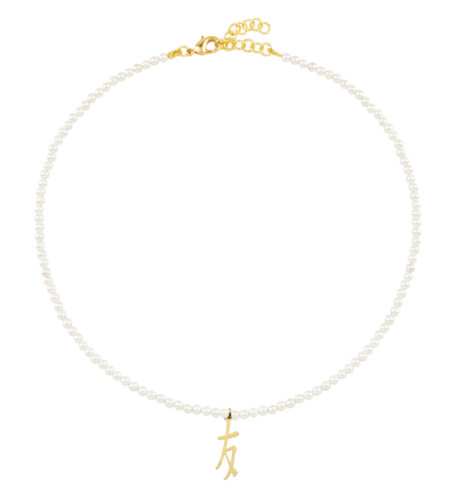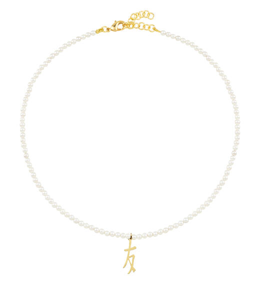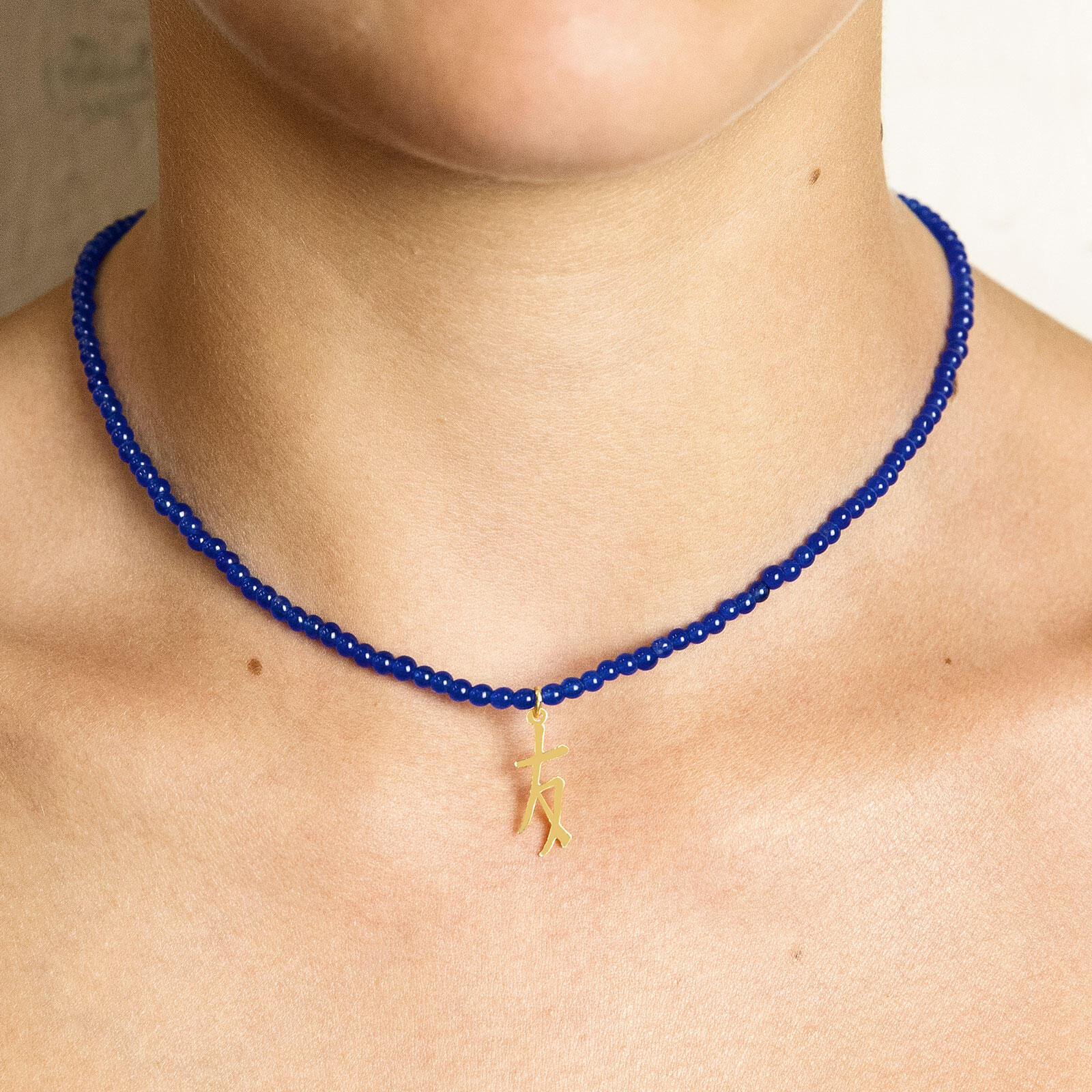 Necklace in natural colored stones, Kanji Friendship in gold-plated brass. Chain length 40 cm. Pendant length 2 cm. Made in Italy.