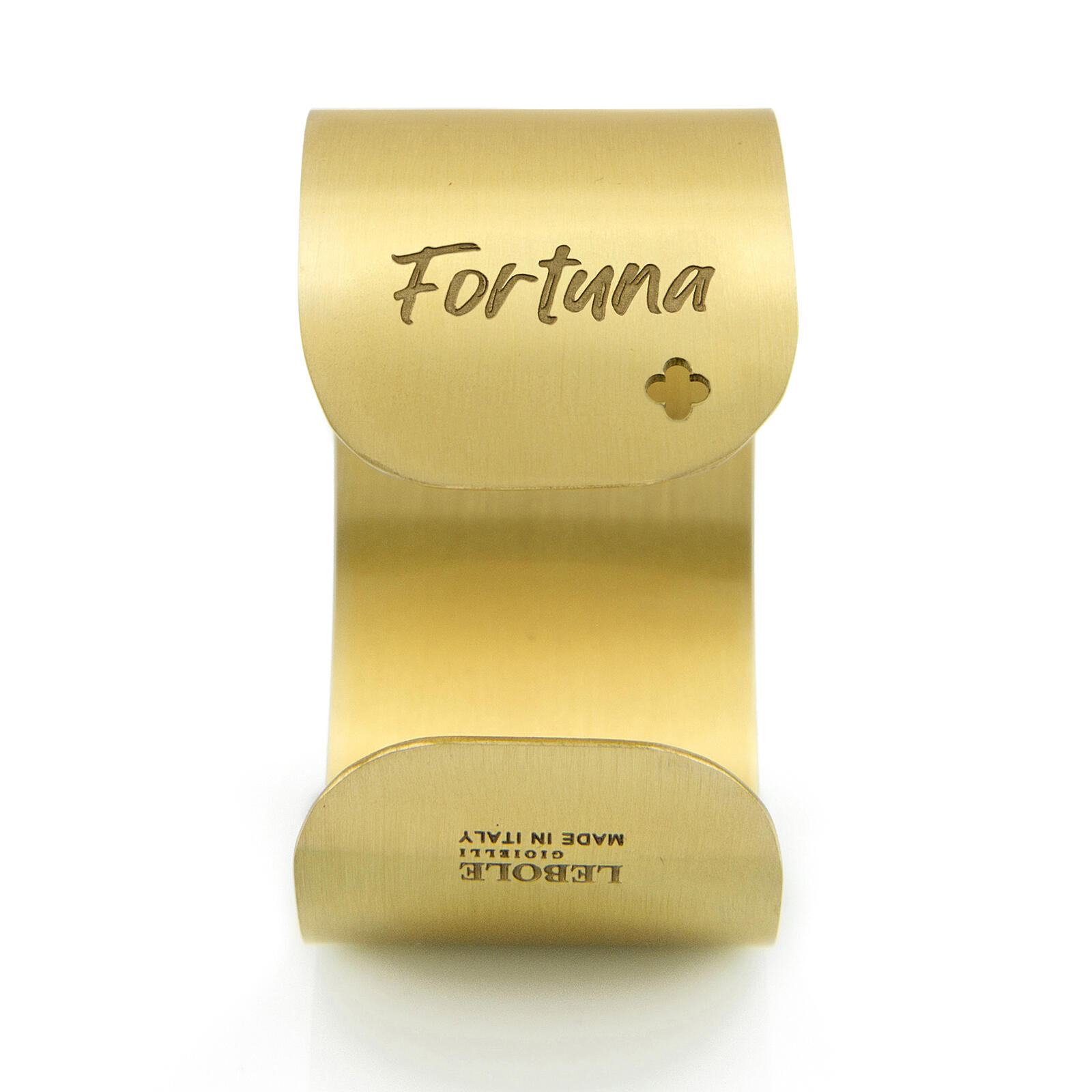 Rigid bracelet with lucky Kanji, in gold galvanized brass. Bracelet height 1.5 cm. Diameter 5.5 cm. Made in Italy.