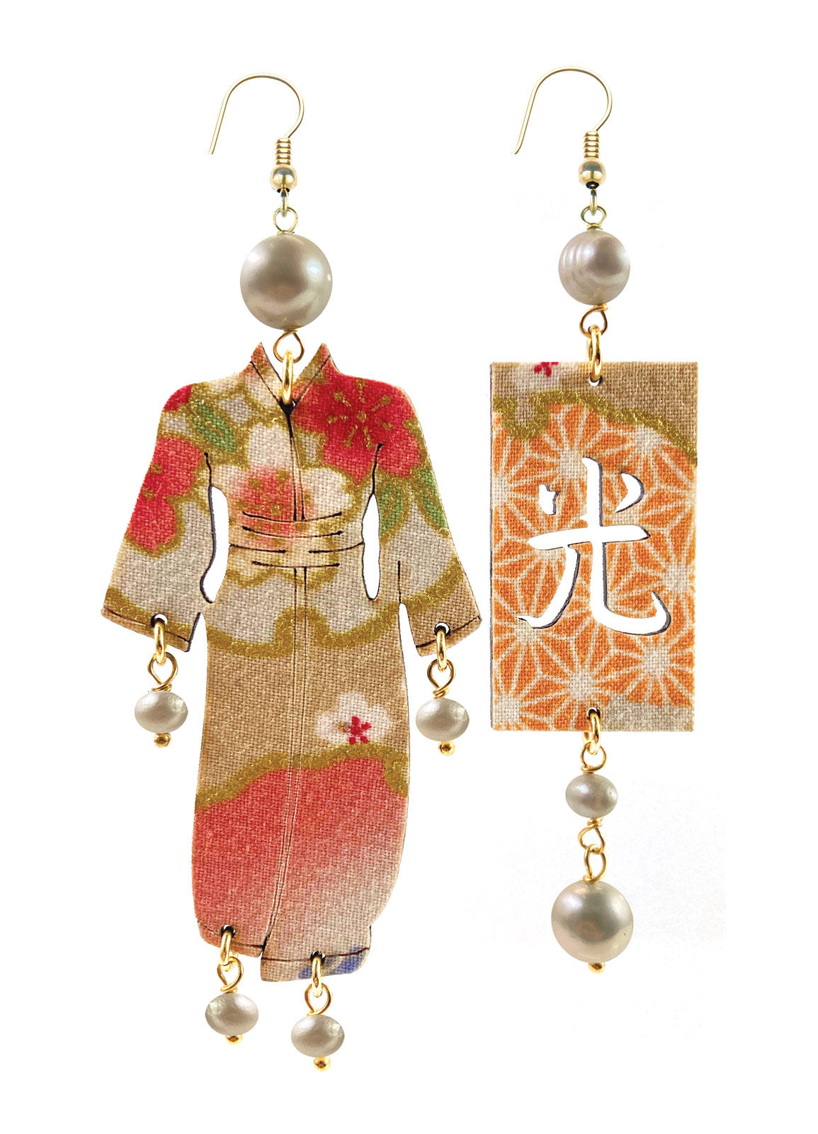 The kimono collection uses ancient Japanese kimono fabrics for the realization of the earrings, spread with a particular procedure on a very light wooden core. The stones are natural and the elements in gold galvanized brass. The pair of earrings is asymmetrical; on one lobe a mannequin dressed in a kimono and on the other a Japanese ideogram which means light. Measure 10.5 cm. Made in Italy