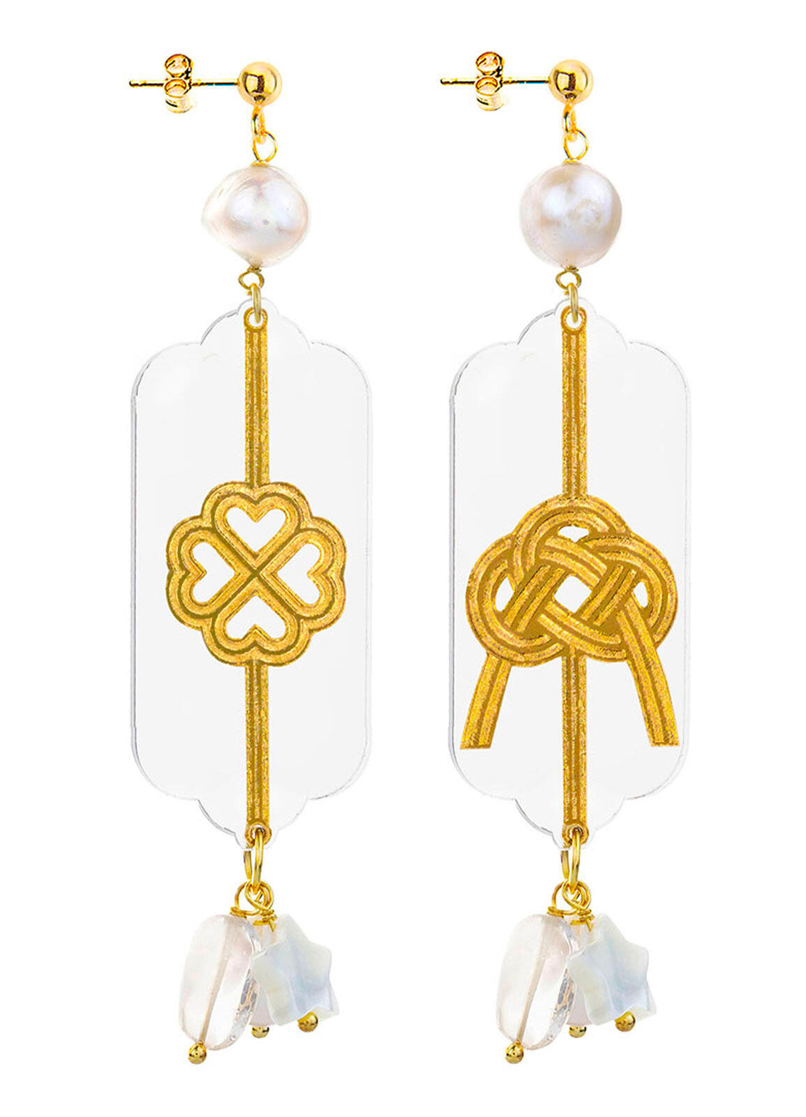 I quattro musubi danno vita a due coppie di orecchini: Hanamusubi con Katabami, Musubikiri con il nodo dell’Infinito. I materiali restano fedeli alla tradizione Lebole: seta da antichi kimono giapponesi, tessuti a righe o pois, ottone galvanizzato oro e pietre naturali.
