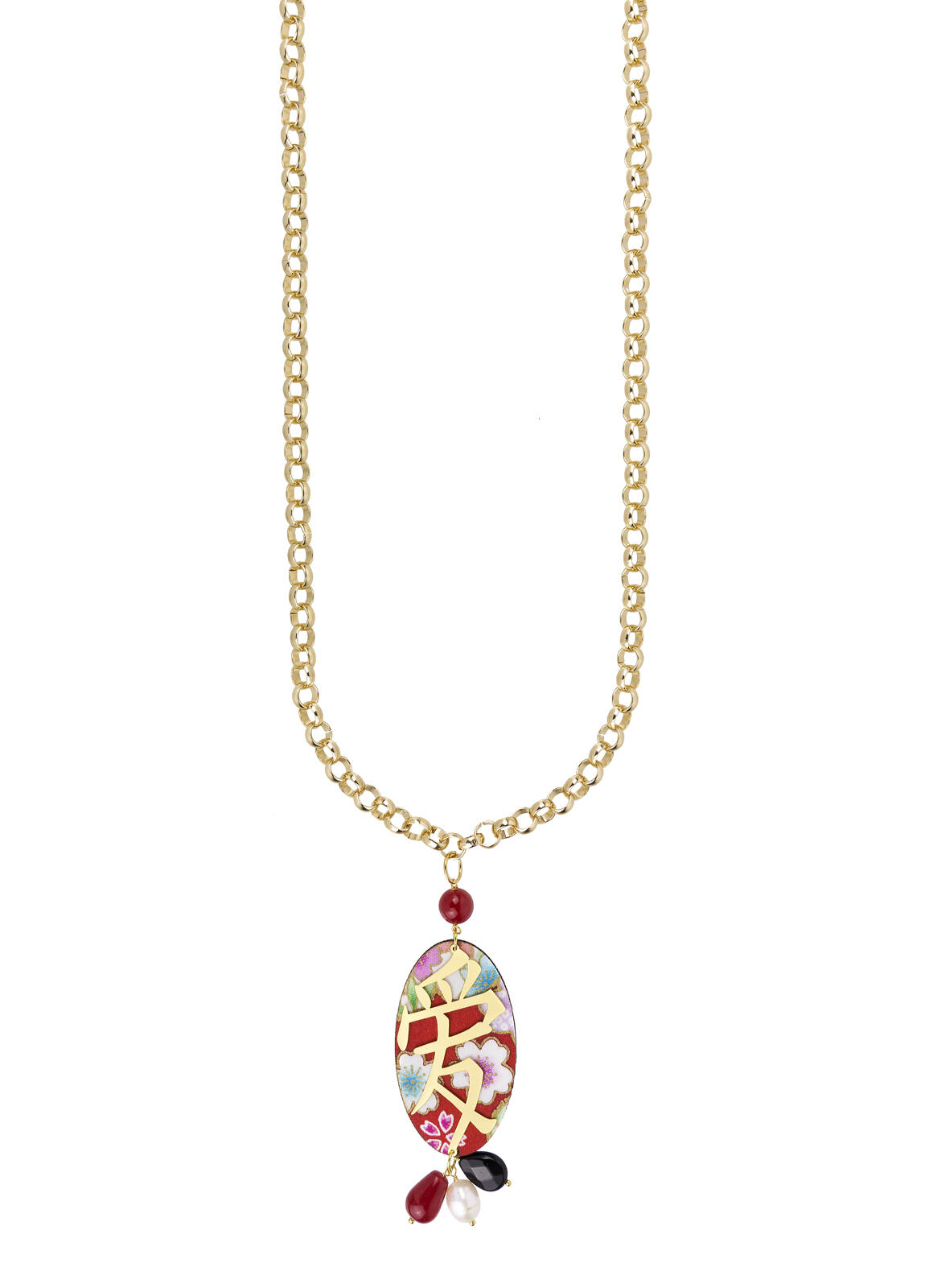 Collana Kanji Amore in ottone galvanizzato oro, elemento in tessuto steso su un'anima di legno leggerissima e pietre naturali. Lunghezza catena 90 cm, ciondolo 11 cm. Made in Italy