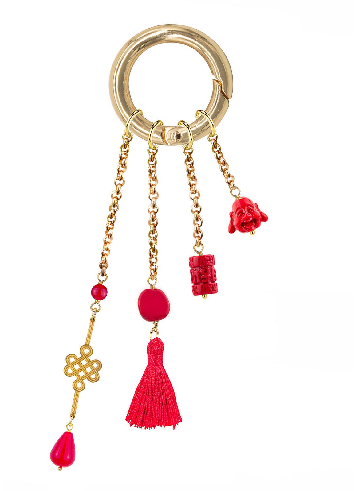 Charm bag in alluminio galvanizzato oro e pietre naturali. Lunghezza catena 12 cm. Chiusura con moschettone. Made in Italy