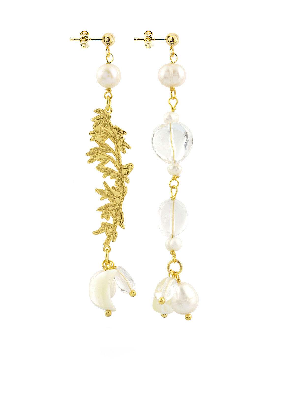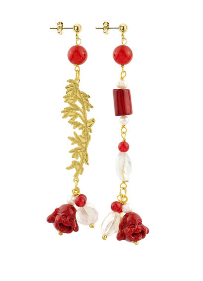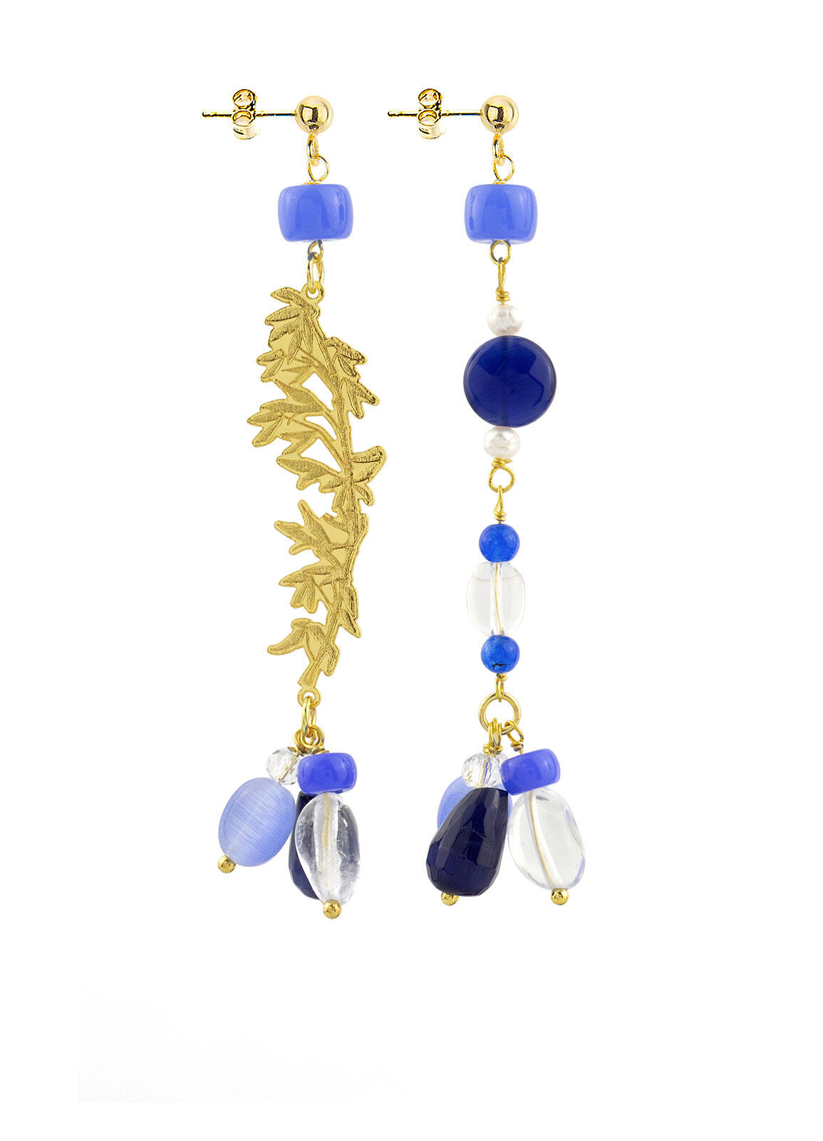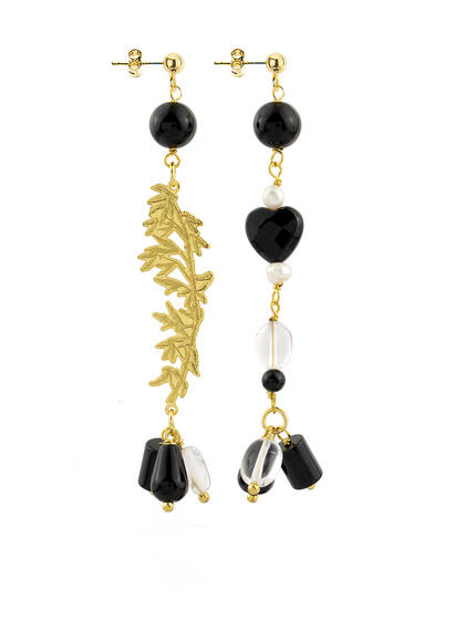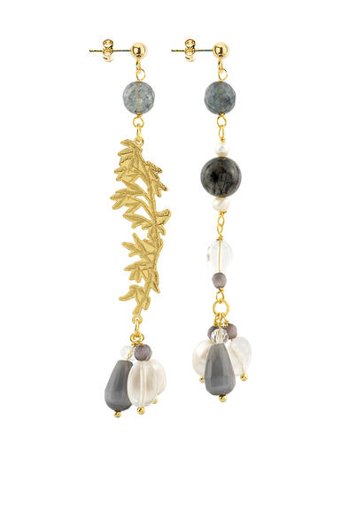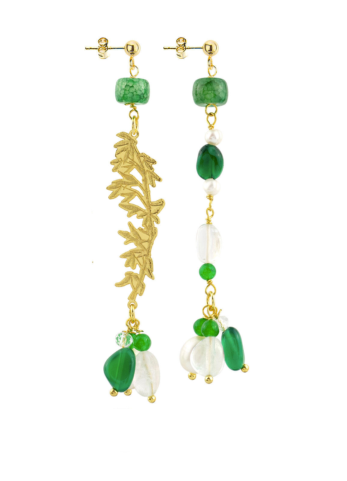 Orecchini in ottone galvanizzato oro, bambù e pietre naturali. Lunghezza 9 cm. Chiusura perno e farfalla. Made in Italy.