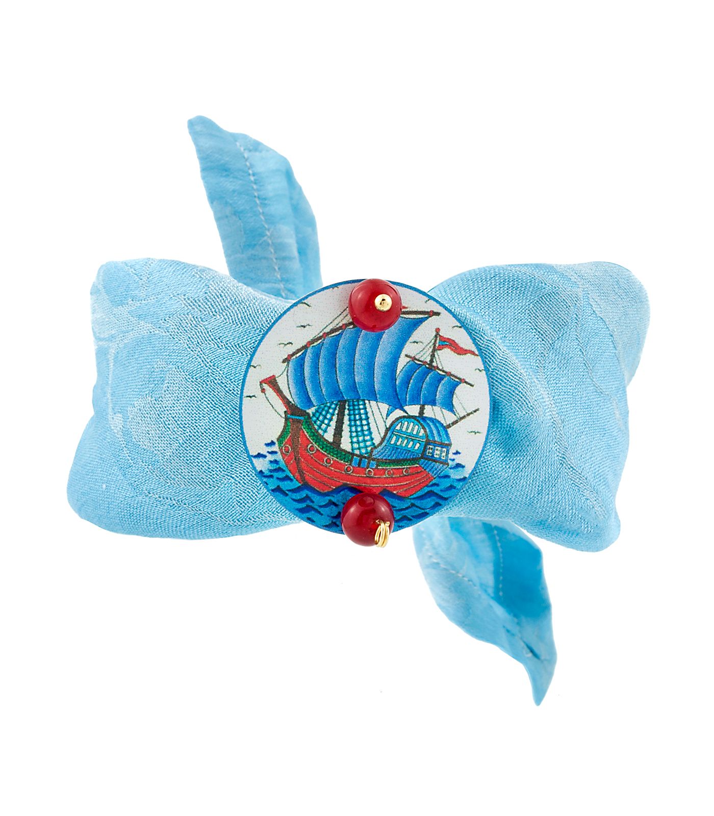 Ogni bracciale è un intreccio di materiali iconici della Maison: la capsule piatta, simbolo di design e ironia, si lega alle sete dai motivi esclusivi, per dare vita a un accessorio leggero, colorato, sorprendente.
