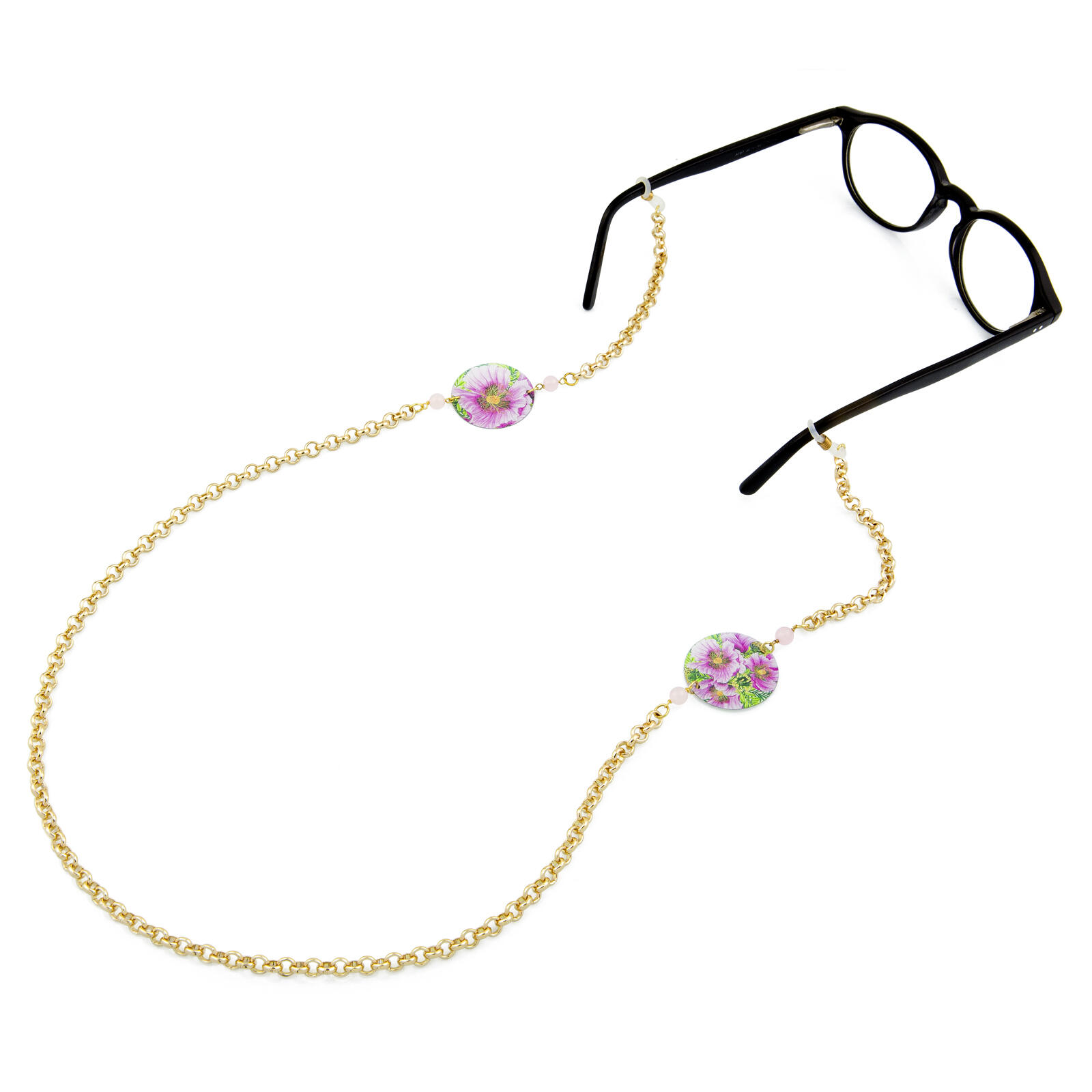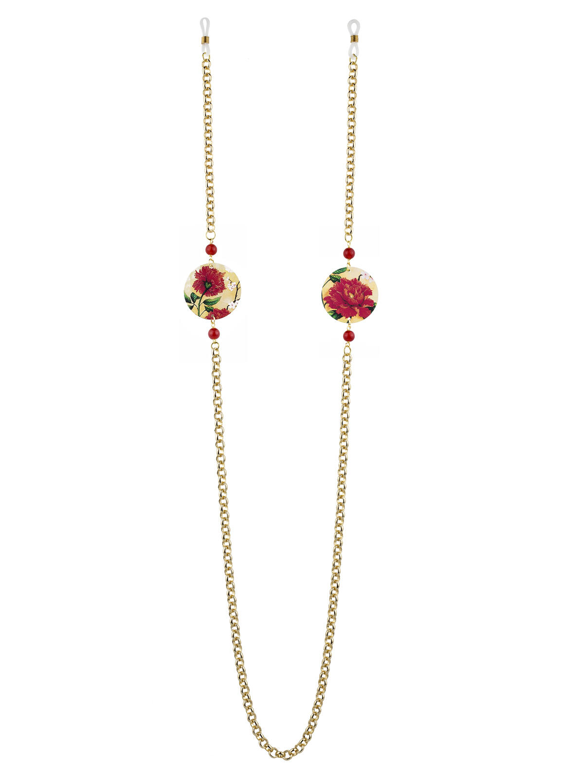 Accessorio porta occhiali con catena in ottone bagnato oro ed elementi della collezione The Circle. Lunghezza catena 85 cm. Lunghezza elemento 3 cm. Taglia Unica. Made in Italy