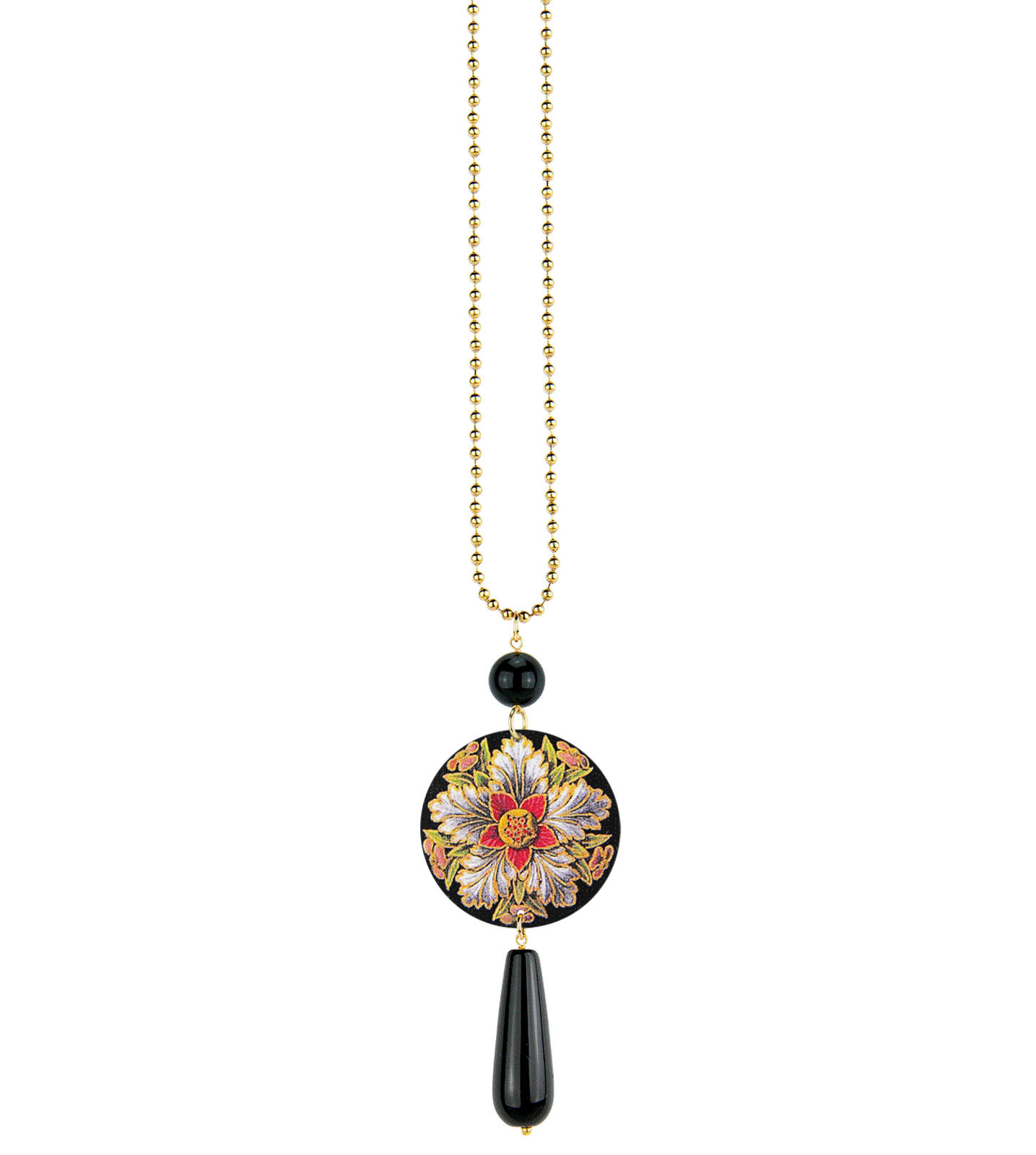 Collana con capsula e pietra. Catena in ottone galvanizzato oro misura 85 cm. Lunghezza ciondolo 9 cm. Made in Italy