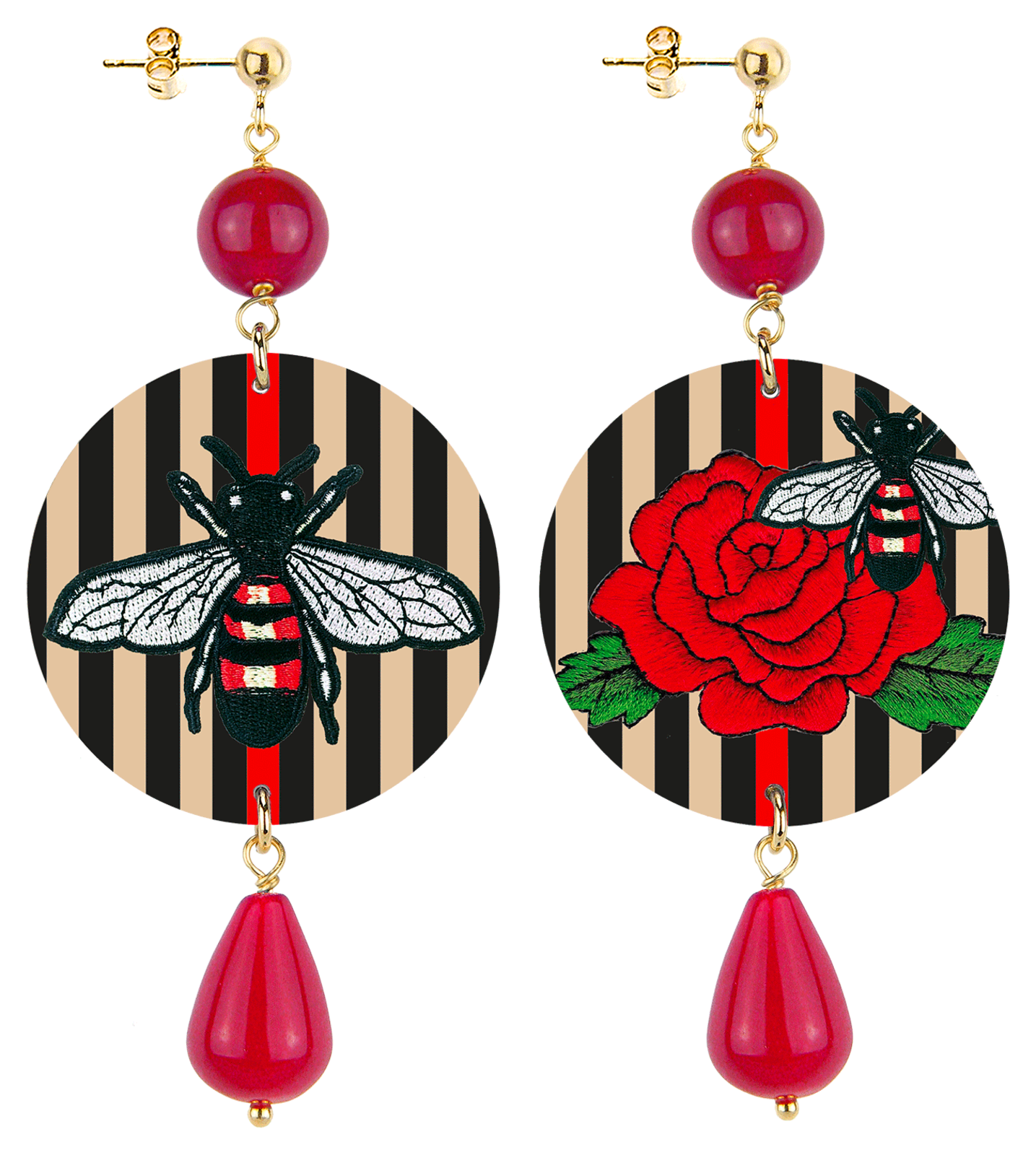 Gli orecchini della collezione The Circle di Lebole Maison sono realizzati con capsule piatte stampate su banda stagnata, montati in ottone galvanizzato oro e pietre naturali. L’asimmetria è data dalle diverse immagini impresse nella capsula.