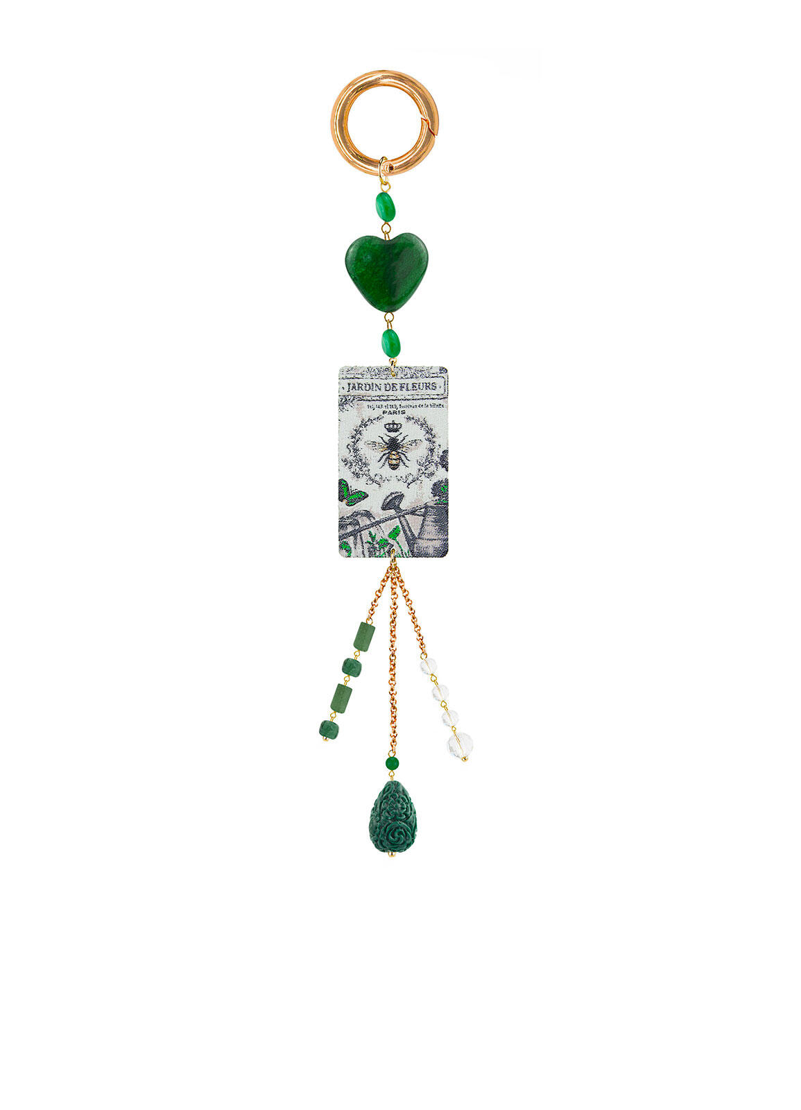 Charm Bag composti da etichetta ricamata. Elementi in ottone galvanizzato oro e pietre naturali. Lunghezza 25/26 cm. Lunghezza Tag 5 cm. Made in Italy