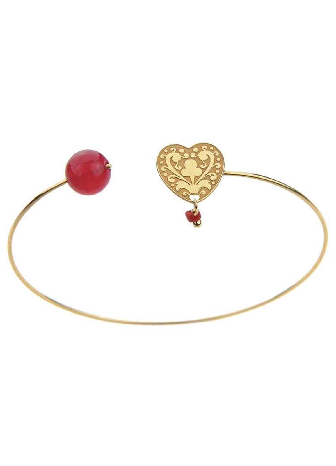 Bracciale filo rigido con elemento cuore e pietra natuale. Argento 925 galvanizzato oro. Diametro 6 cm. Made in Italy.