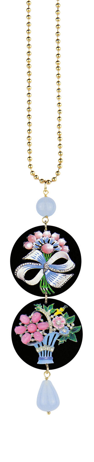 Collana con capsule The Circle e pietre. Catena in ottone bagnato oro, lunghezza 85 cm. Lunghezza ciondolo 16 cm. Diametro capsula 3,5 cm. Made in Italy