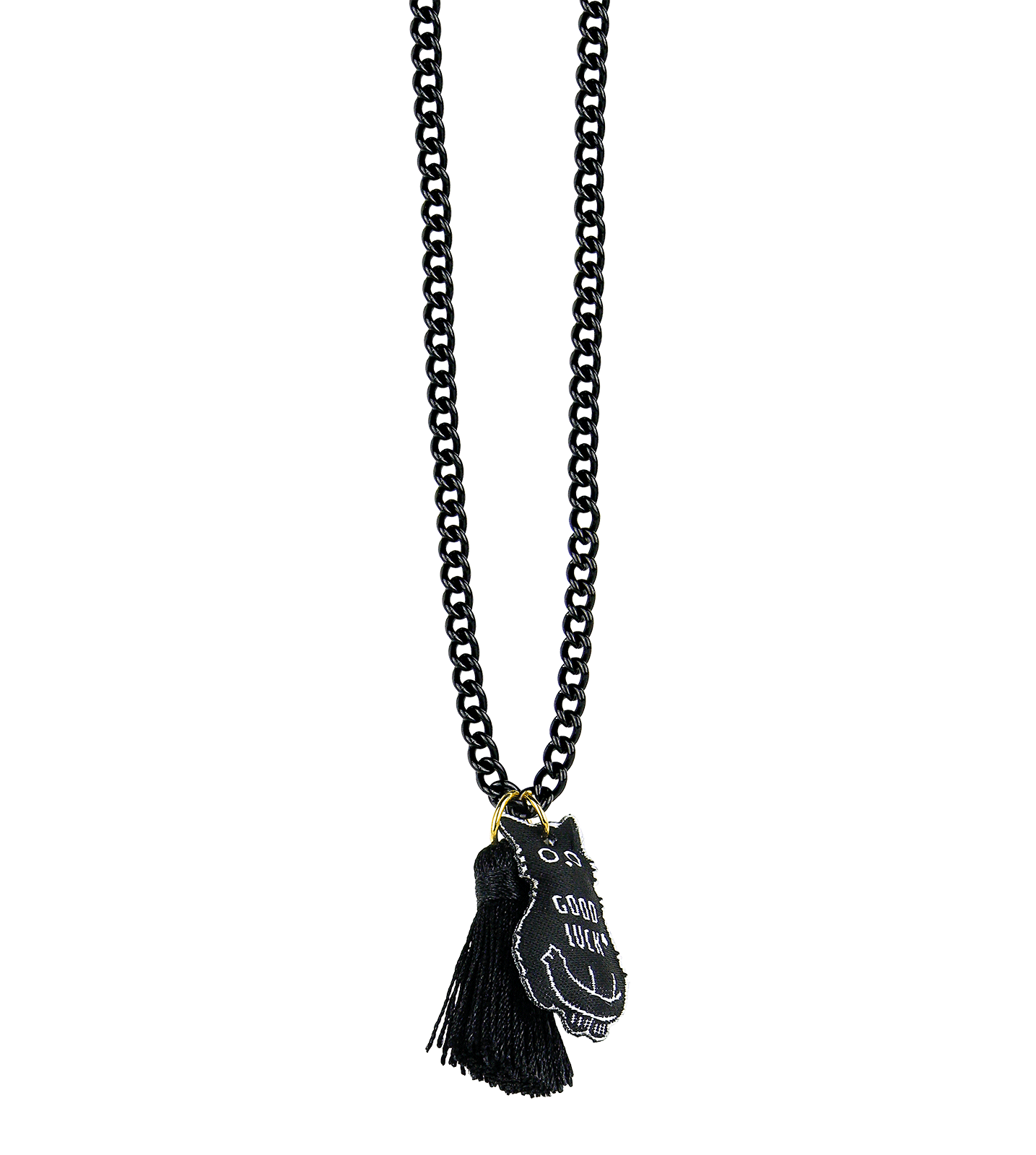Collana in ottone galvanizzato oro, lunghezza 45 cm. Ciondolo ricamato a telaio e imbottito, lunghezza 3 cm. Made in Italy