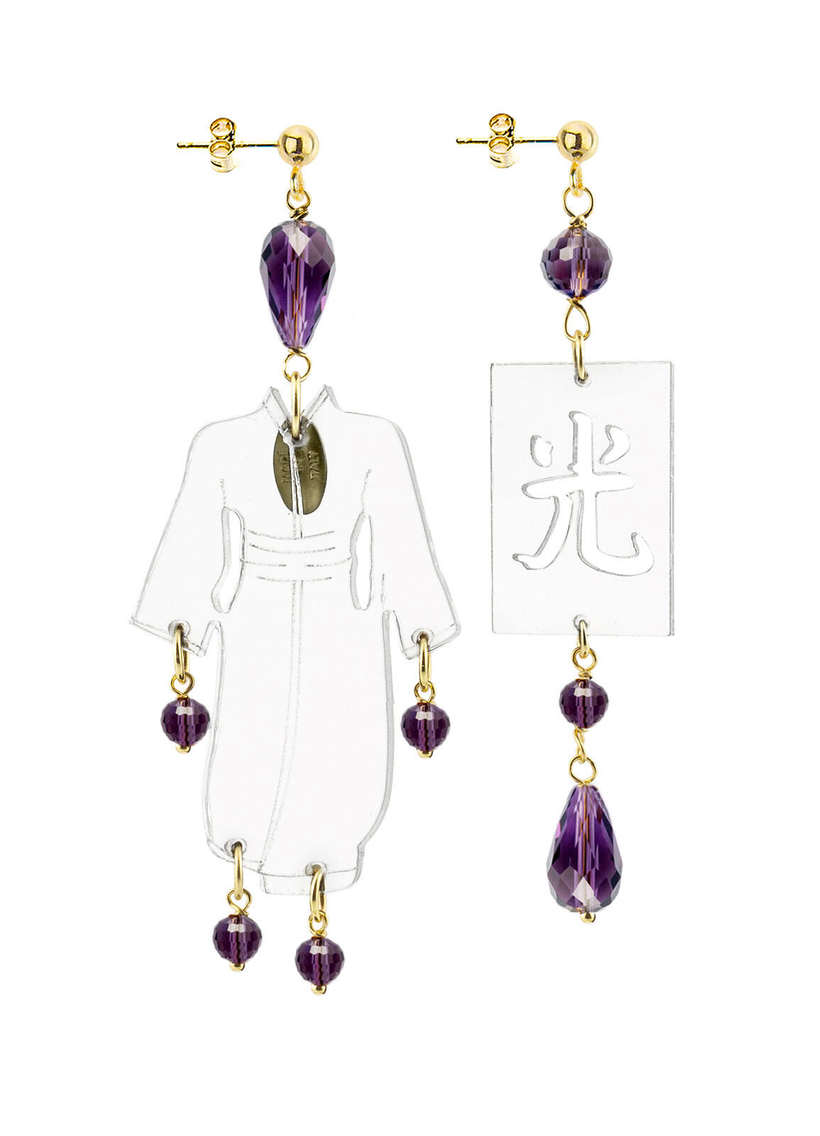 Le immagini raffigurate negli orecchini sono due: una figura vestita con kimono e un ideogramma giapponese che significa luce. Le misure degli orecchini Kimono sono diverse, per riuscire meglio a racchiudere le esigenze di tutte le fruitrici.