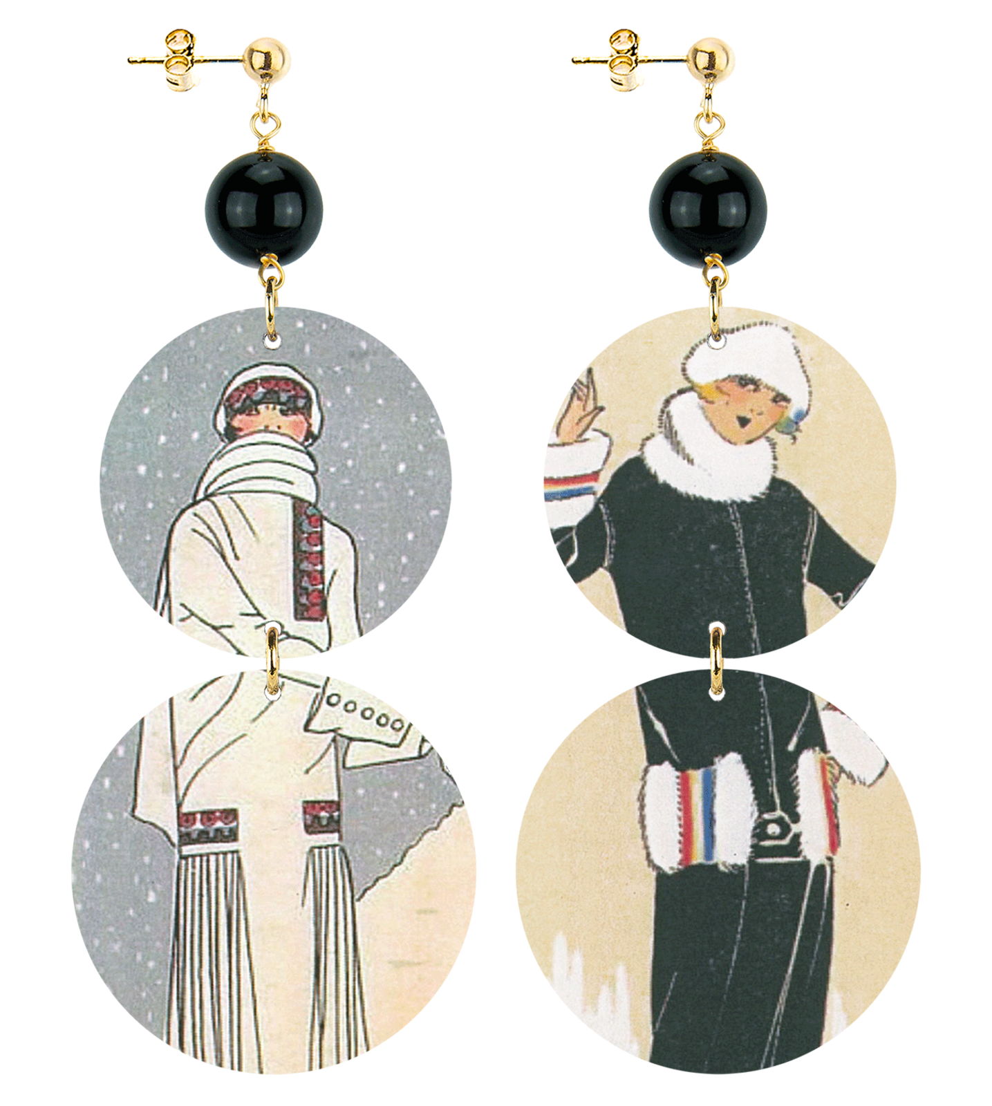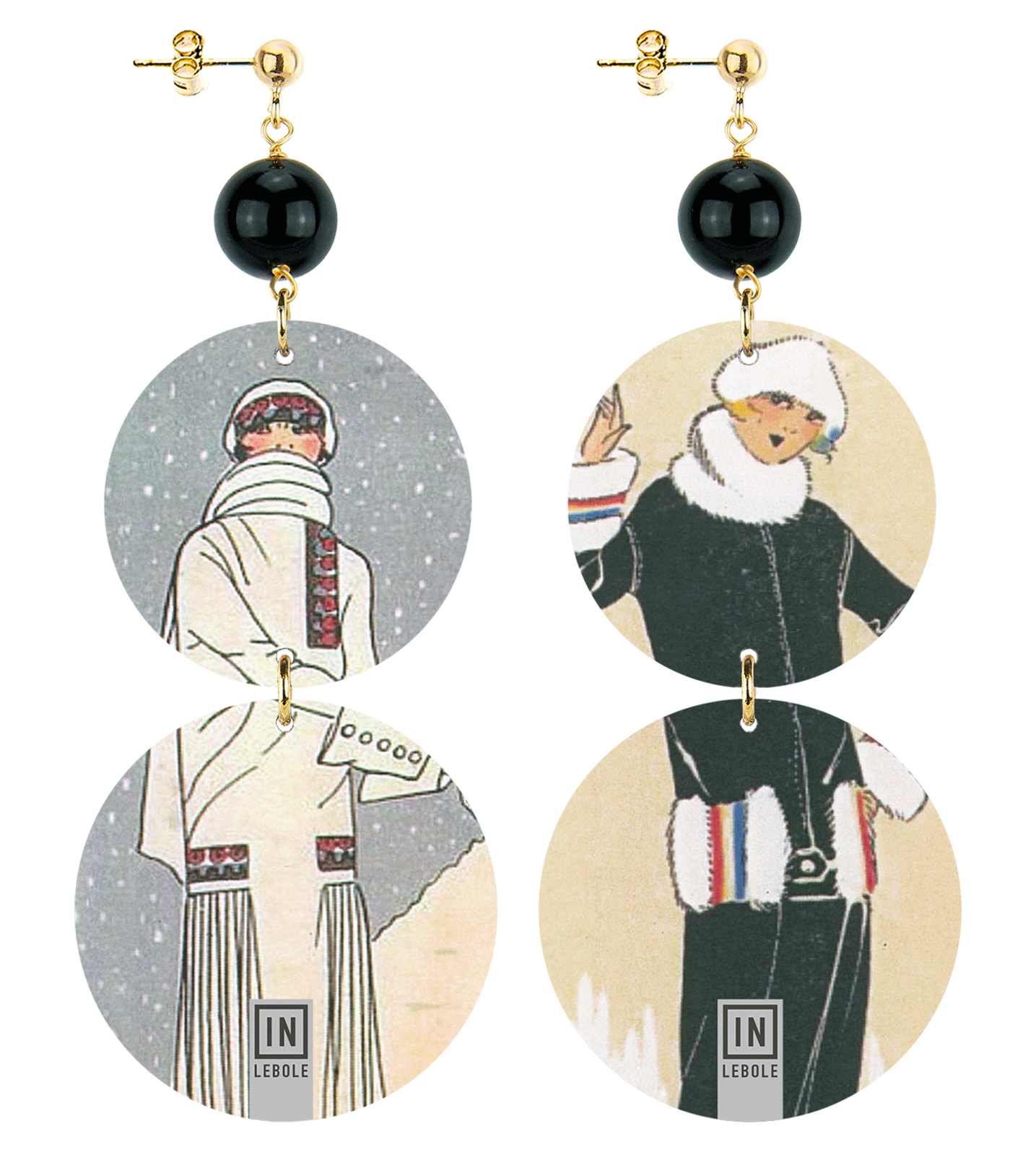 Gli orecchini della collezione The Circle di Lebole Maison sono realizzati con capsule piatte stampate su banda stagnata, montati in ottone galvanizzato oro e pietre naturali. L’asimmetria è data dalle diverse immagini impresse nella capsula.
