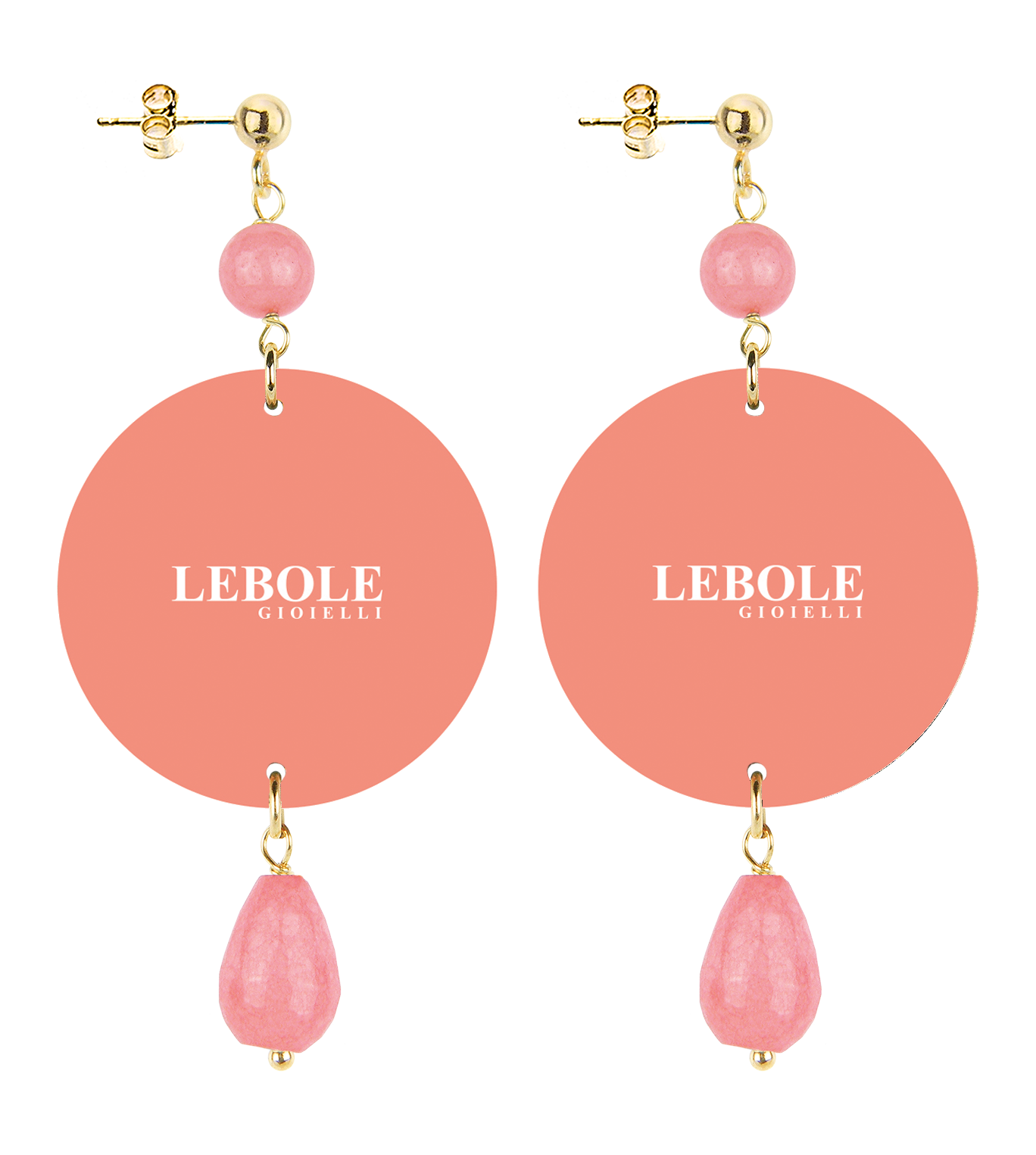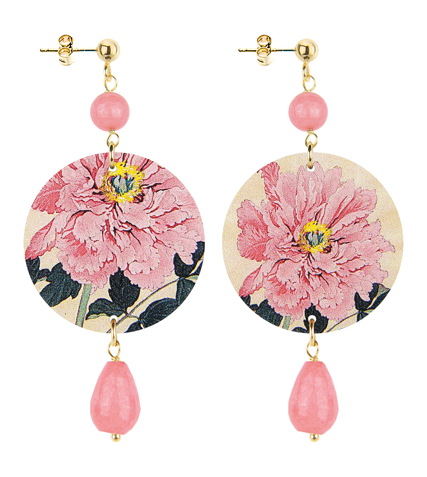 Orecchini composti da una capsula piatta stampata. Elementi in ottone galvanizzato oro e pietre naturali. Lunghezza 6,5 cm. Diametro 3 cm. Made in Italy
