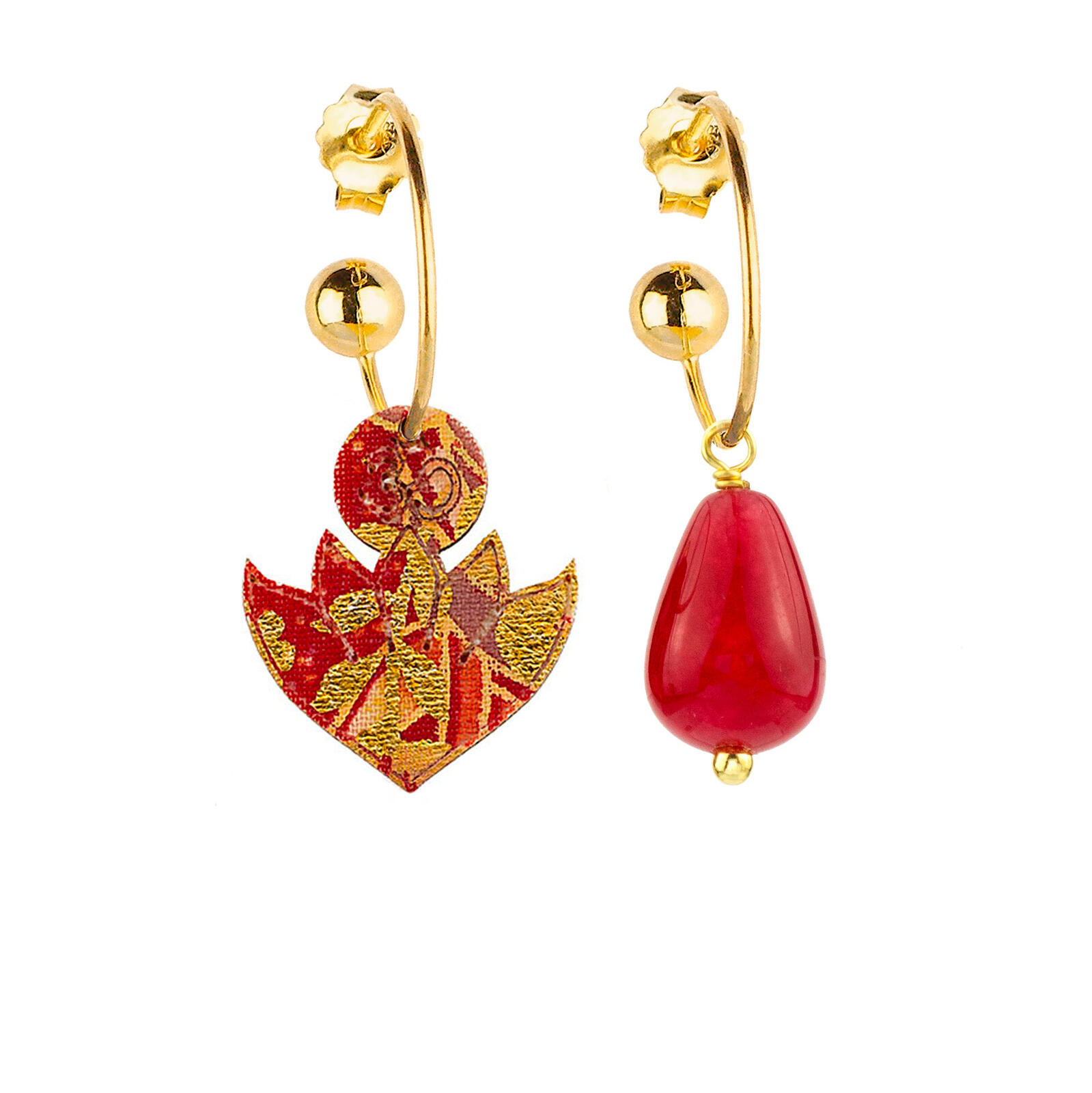 Orecchini in tessuto di kimono steso su un'anima di legno, ottone galvanizzato oro e pietre naturali. Lunghezza 2 cm. Chiusura perno e farfallina. Made in Italy