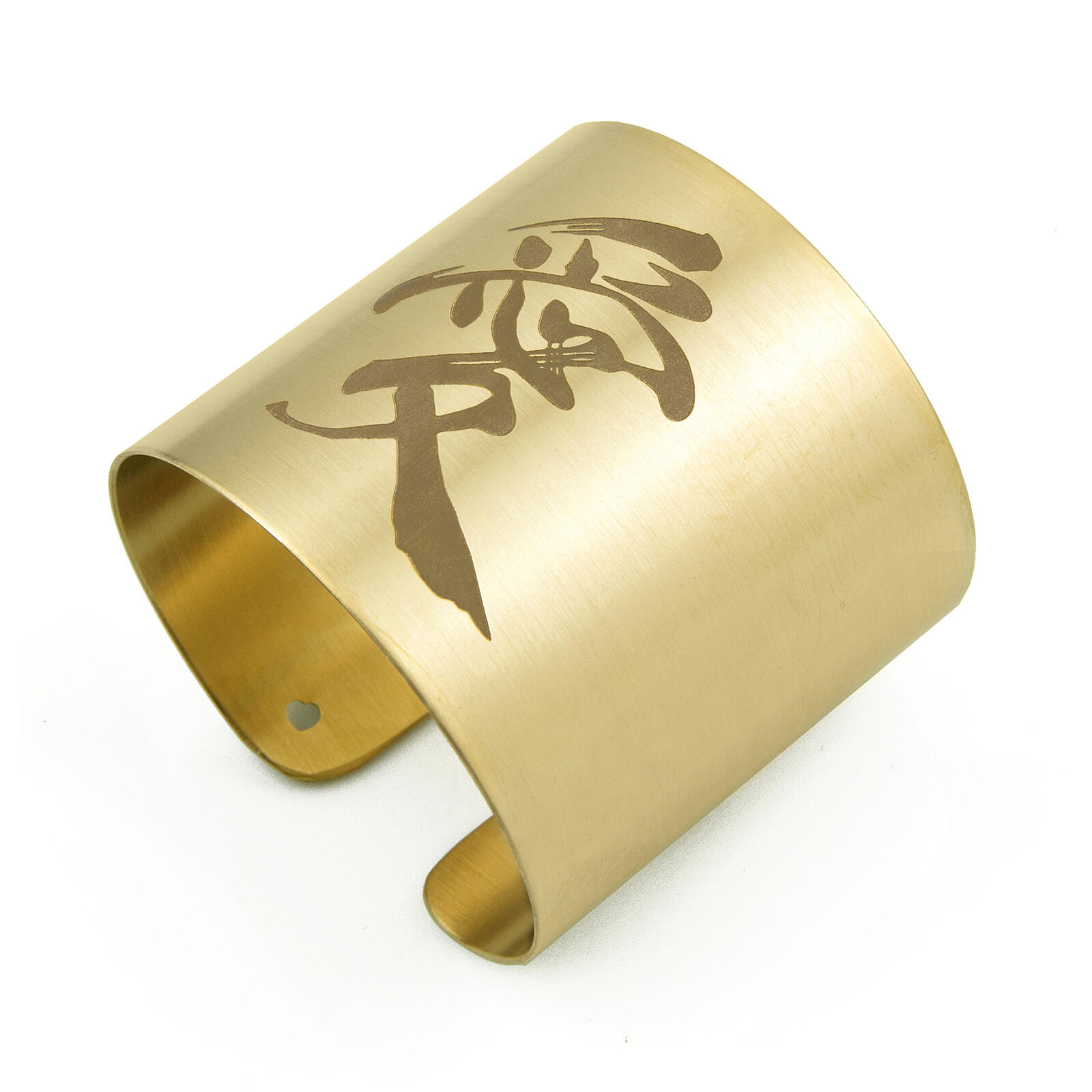 Bracciale rigido con Kanji amore, in ottone galvanizzato oro. Altezza bracciale 5 cm. Diametro 5,5 cm. Made in Italy.
