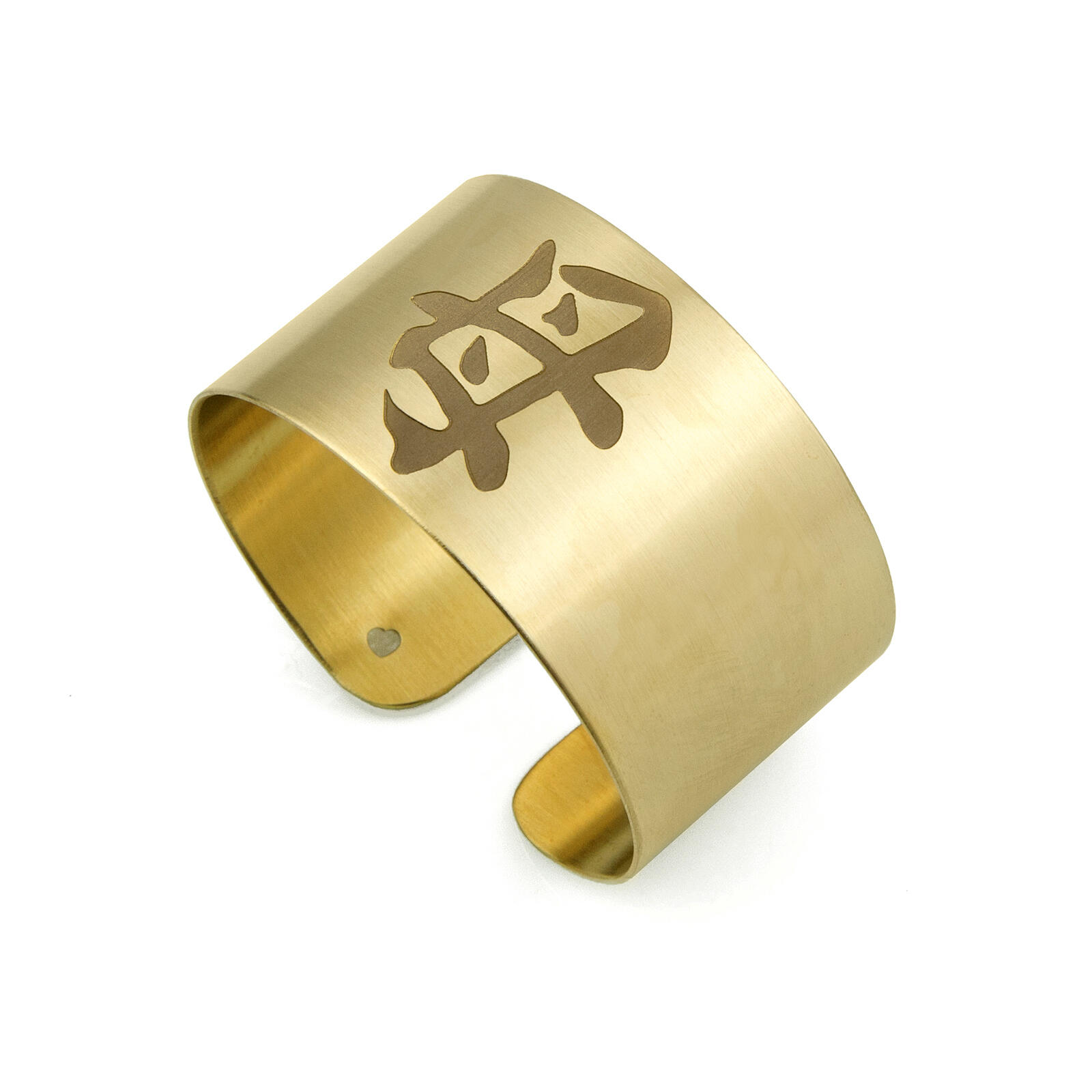 Bracciale rigido con Kanji mamma, in ottone galvanizzato oro. Altezza bracciale 3 cm. Diametro 6 cm. Made in Italy.