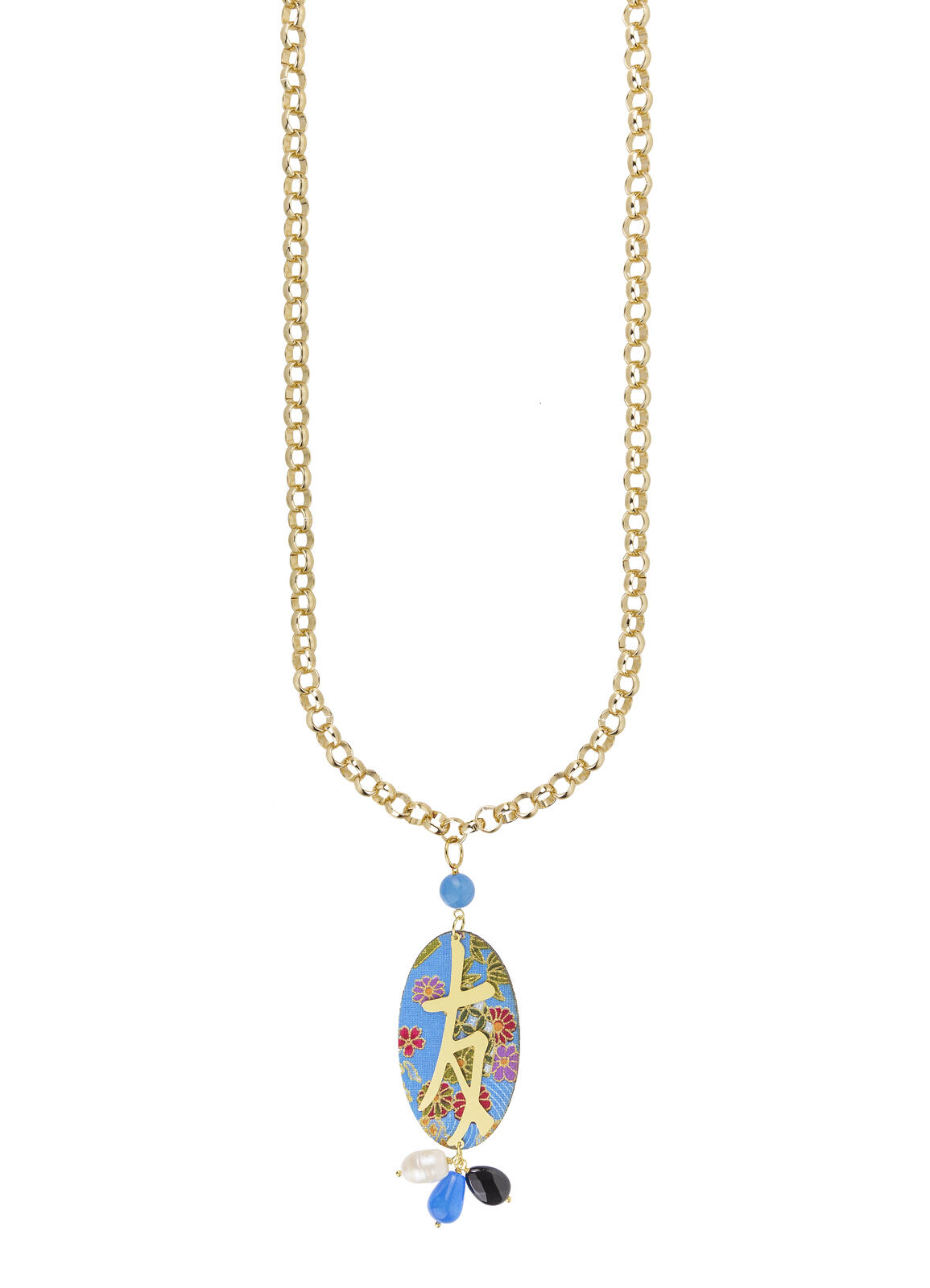 Collana Kanji Amicizia in ottone galvanizzato oro, elemento in tessuto steso su un'anima di legno leggerissima e pietre naturali. Lunghezza catena 90 cm, ciondolo 11 cm. Made in Italy