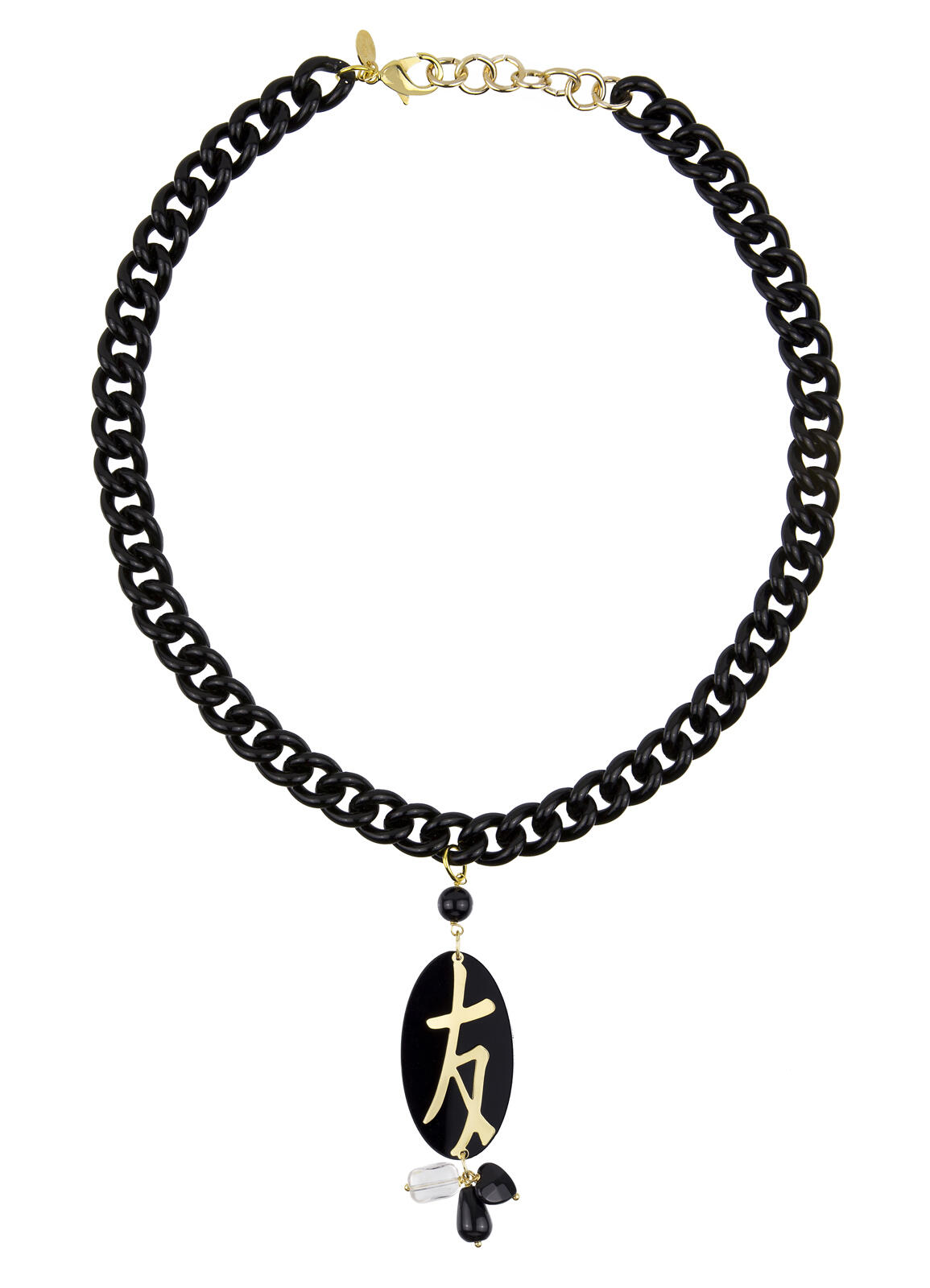 Collana Kanji Amicizia in ottone galvanizzato oro, elemento in plexiglas e pietre naturali.. Lunghezza catena 60 cm. Lunghezza ciondolo 9 cm. Made in Italy