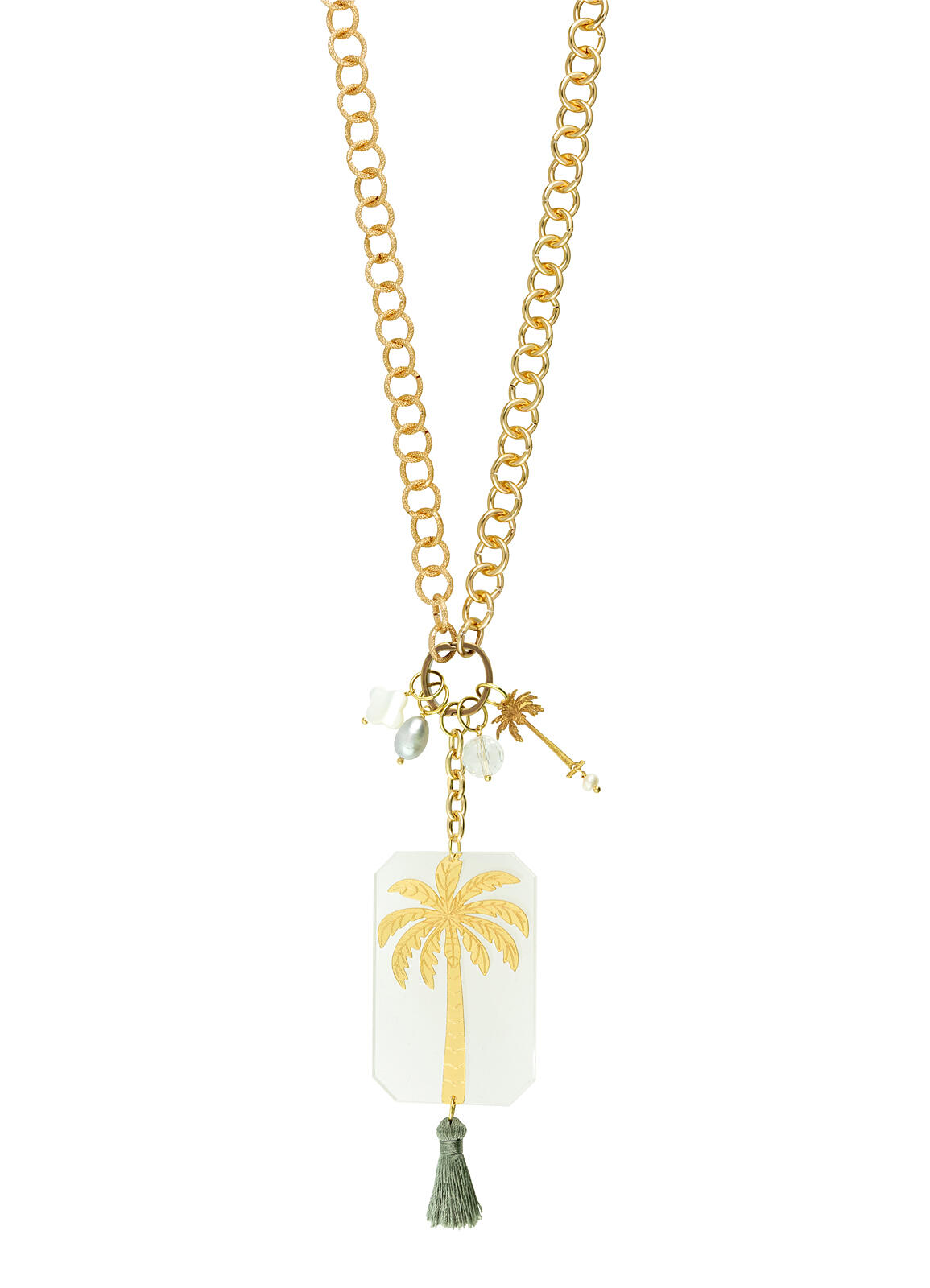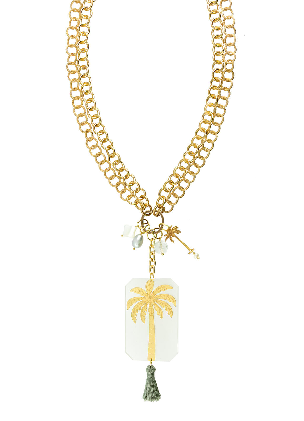 Collana in alluminio, ciondolo in plexiglass, ottone galvanizzato oro e pietre naturali. Lunghezza collana in alluminio regolabile 45/90 cm. Lunghezza ciondolo 7,5 cm. Made in Italy