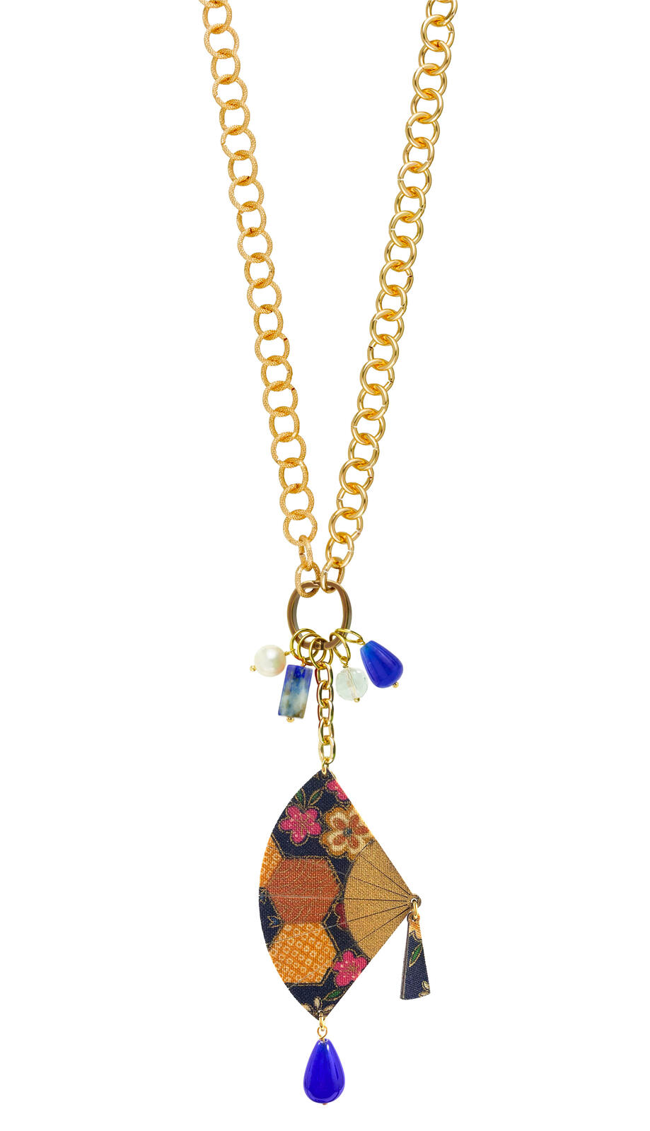 Collana in alluminio galvanizzato oro, elementi, seta e pietre naturali. Lunghezza collana regolabile 53/106 cm. Lunghezza ciondolo 11 cm. Made in Italy