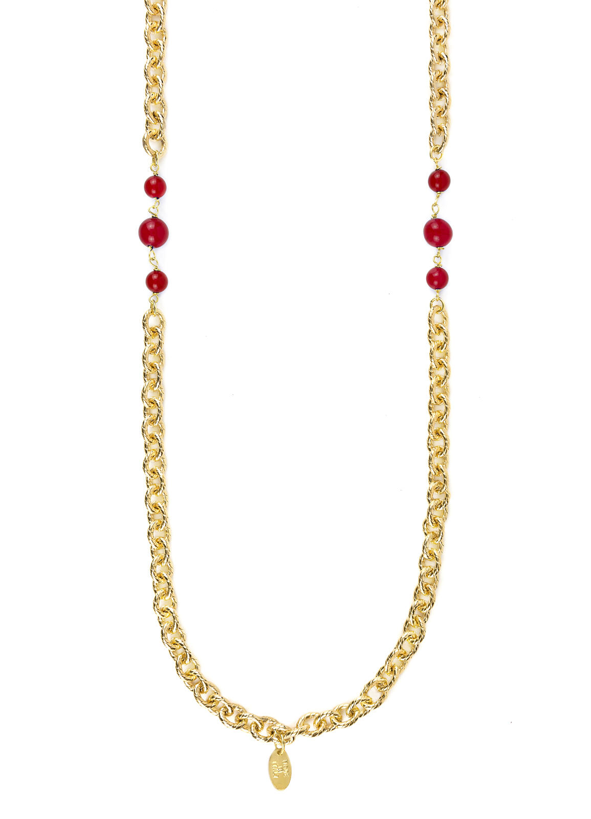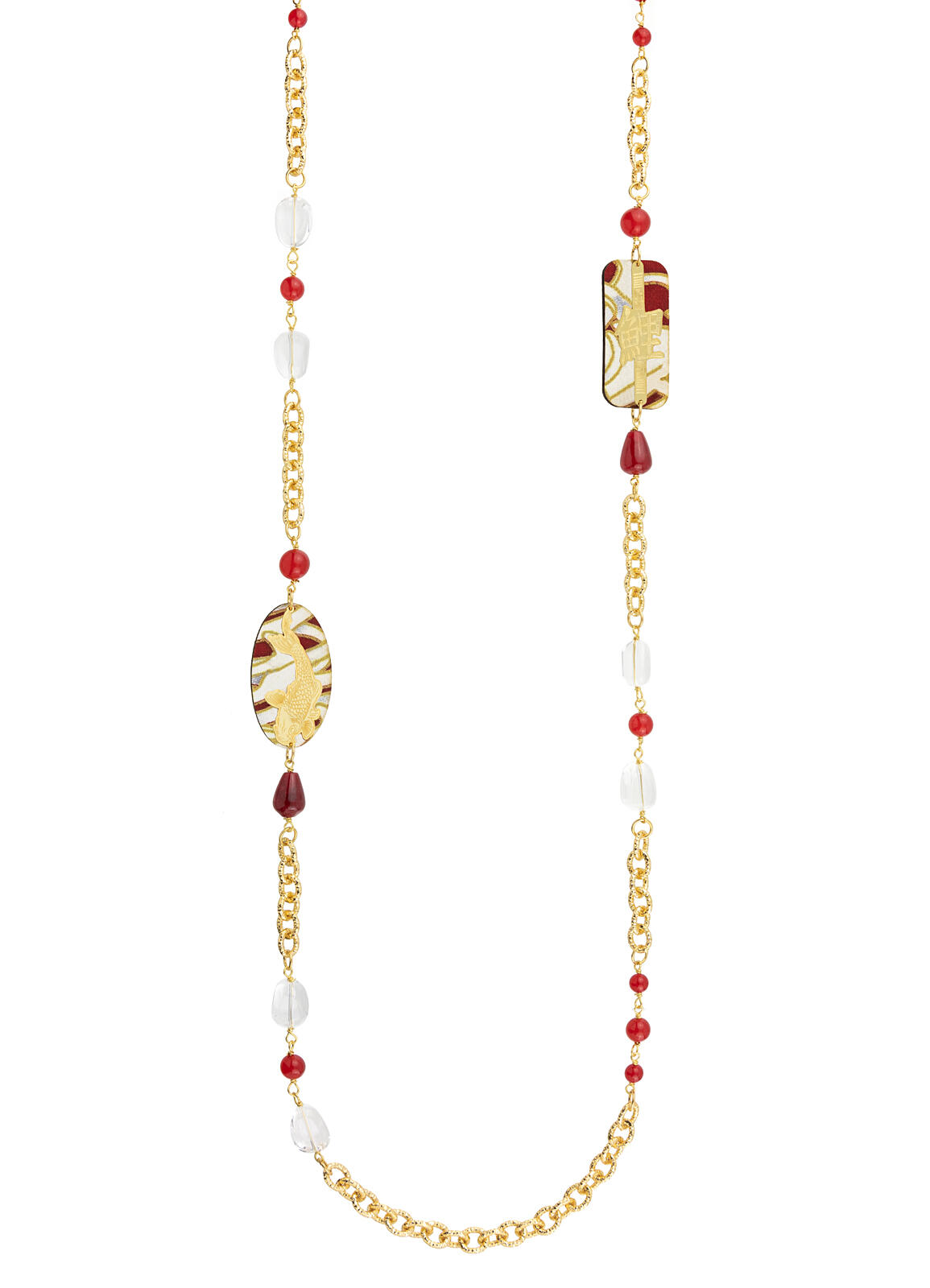 Collana in alluminio galvanizzato oro, carpa koi in tessuto steso su un'anima di legno leggerissima e pietre naturali. Lunghezza catena 110 cm. Lunghezza ciondolo 7 cm. Made in Italy.