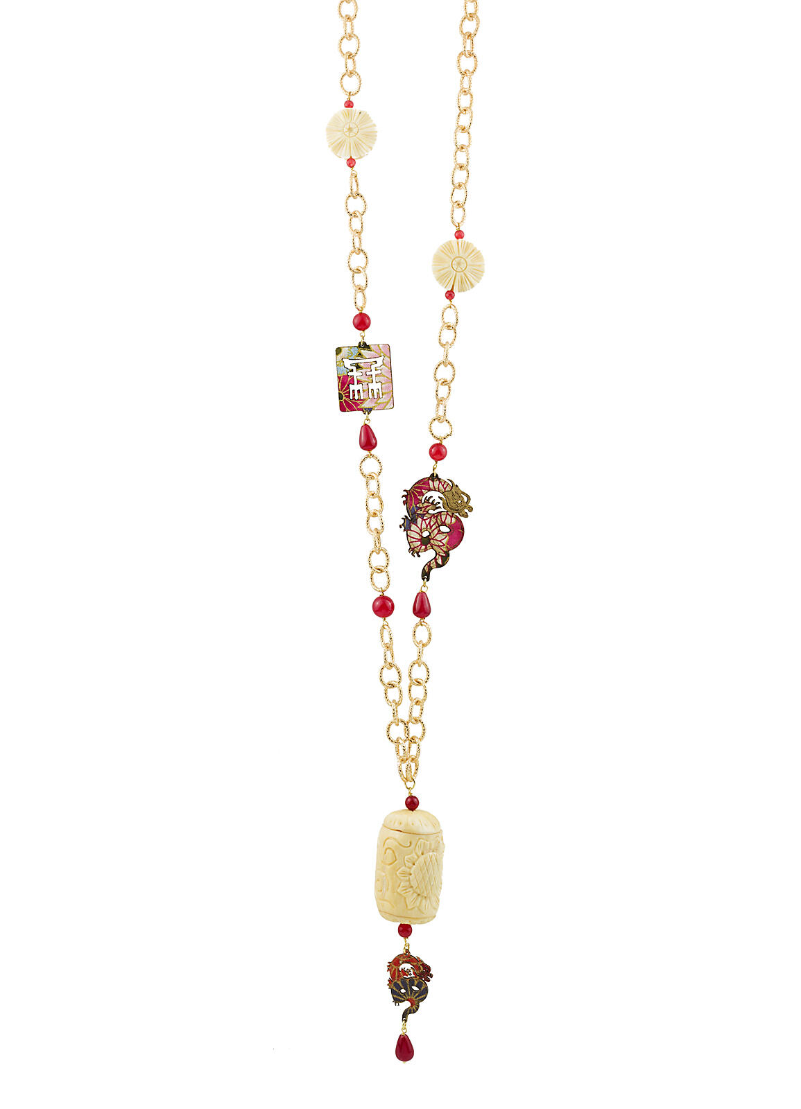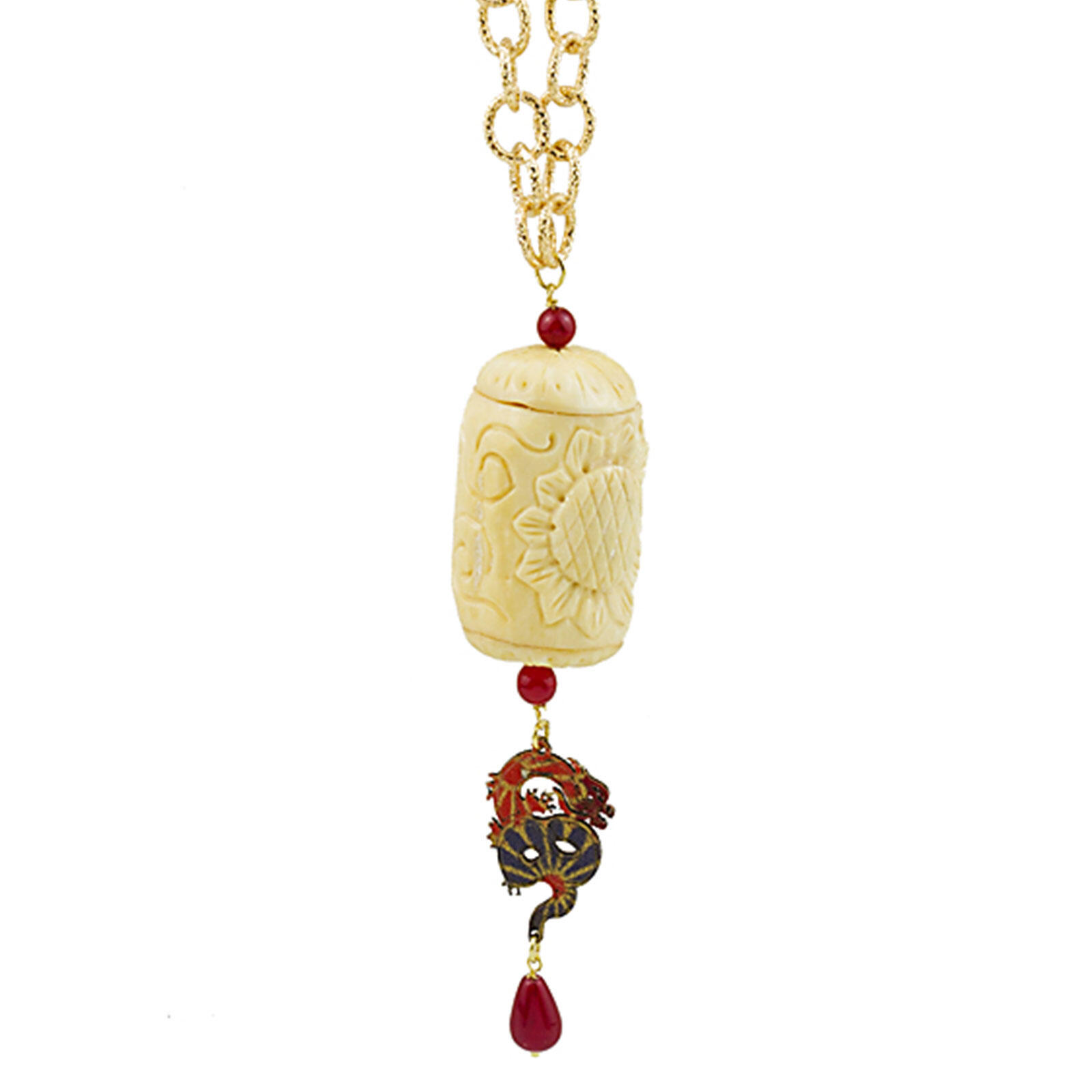 Collana in ottone galvanizzato oro, elementi in tessuto di antichi Kimono della collezione Mito, rappresentanti un drago e la porta del Torii, pietre naturali, elementi in osso inciso a forma di fiore e parte centrale a barattolo sempre inciso con fiore a più petali. Lunghezza catena 90 cm. Lunghezza ciondolo 12 cm. Made in Italy