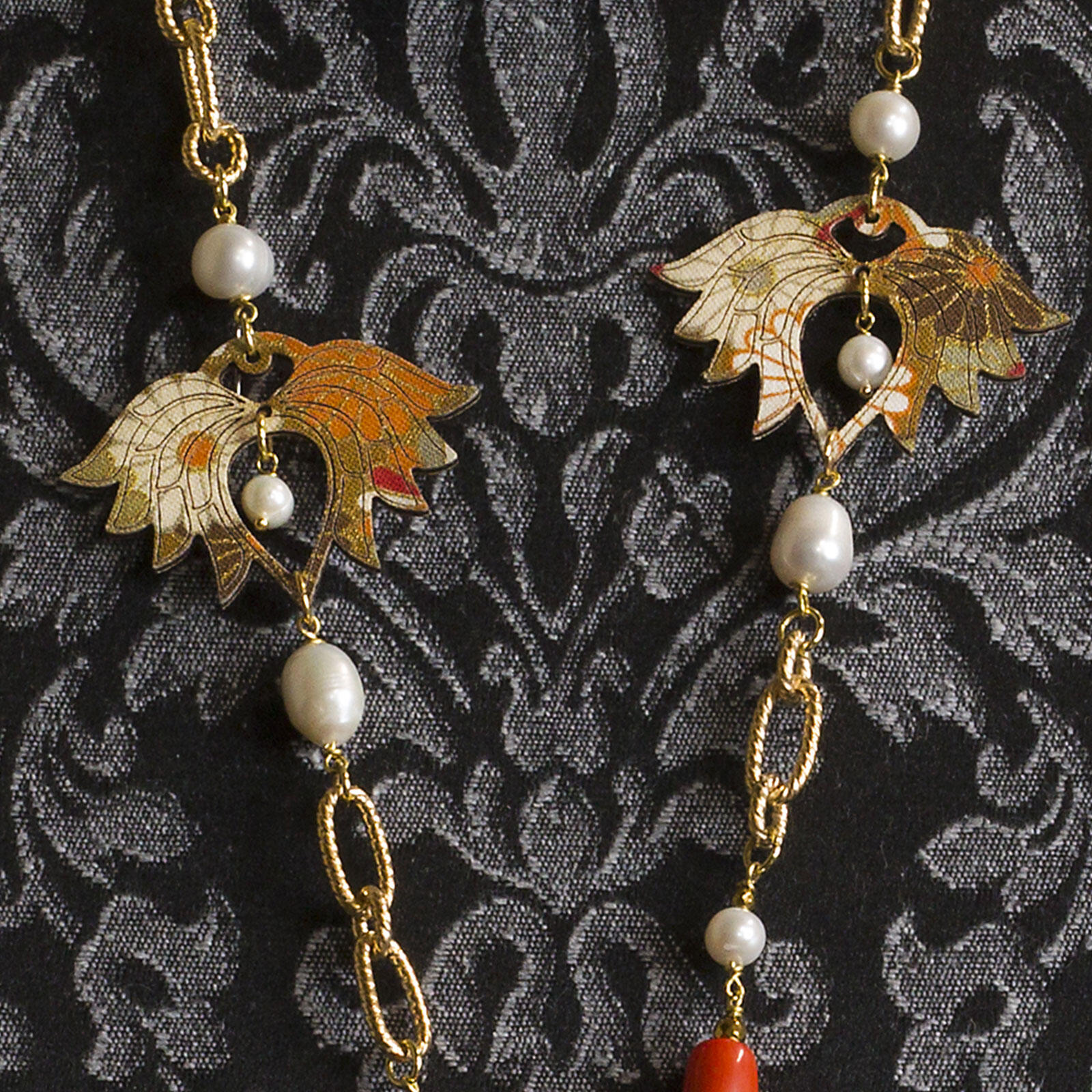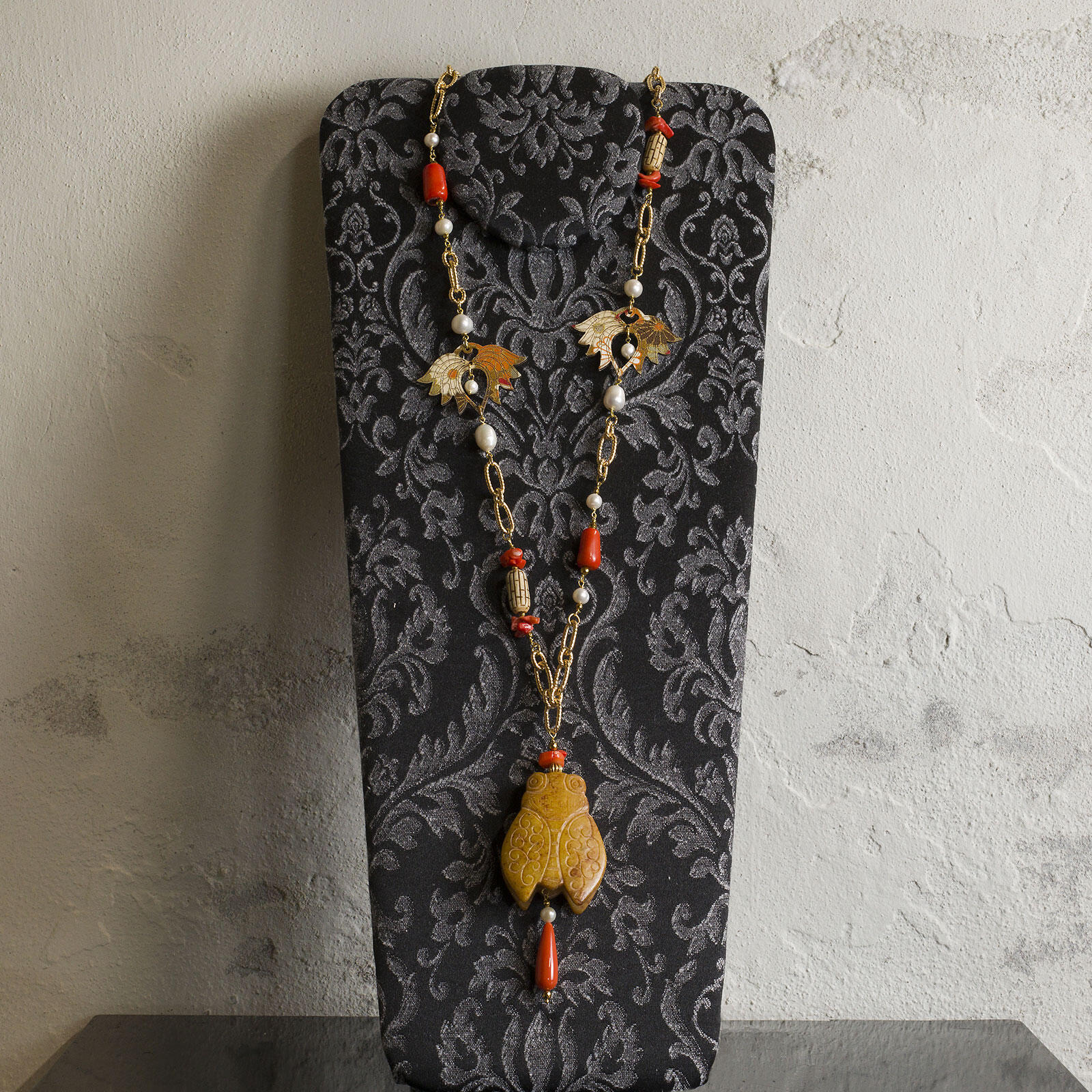 Collana in ottone galvanizzato oro, elementi in tessuto di antichi Kimono della collezione Hasu, rappresentanti due fiori di loto. Perle, elementi in osso incisi resina e corallo. Elemento centrale in pietra marrone incisa con le sembianze di un insetto. Lunghezza catena 90 cm. Lunghezza ciondolo 16 cm. Made in Italy