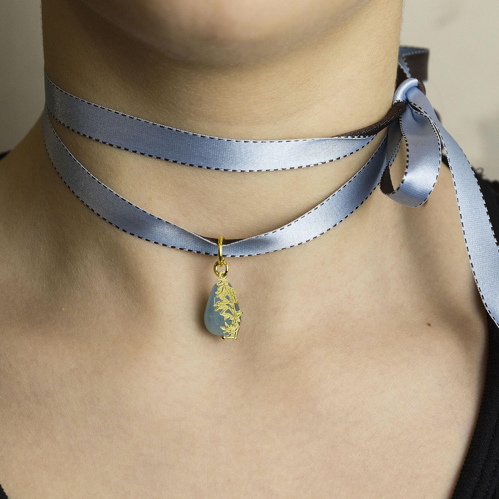Collana Kanji Bambu in tessuto satin e catena galvanizzata oro. Lunghezza nastro 100 cm, lunghezza catena 50 cm lunghezza elemento 2 cm. Made in Italy