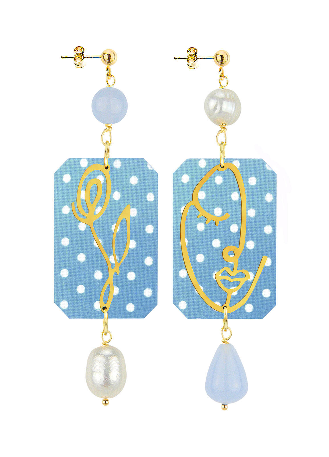 Orecchini in tessuto steso su legno, ottone galvanizzato oro e pietre naturali. Lunghezza 8,5 cm. Chiusura perno e farfalla. Made in Italy