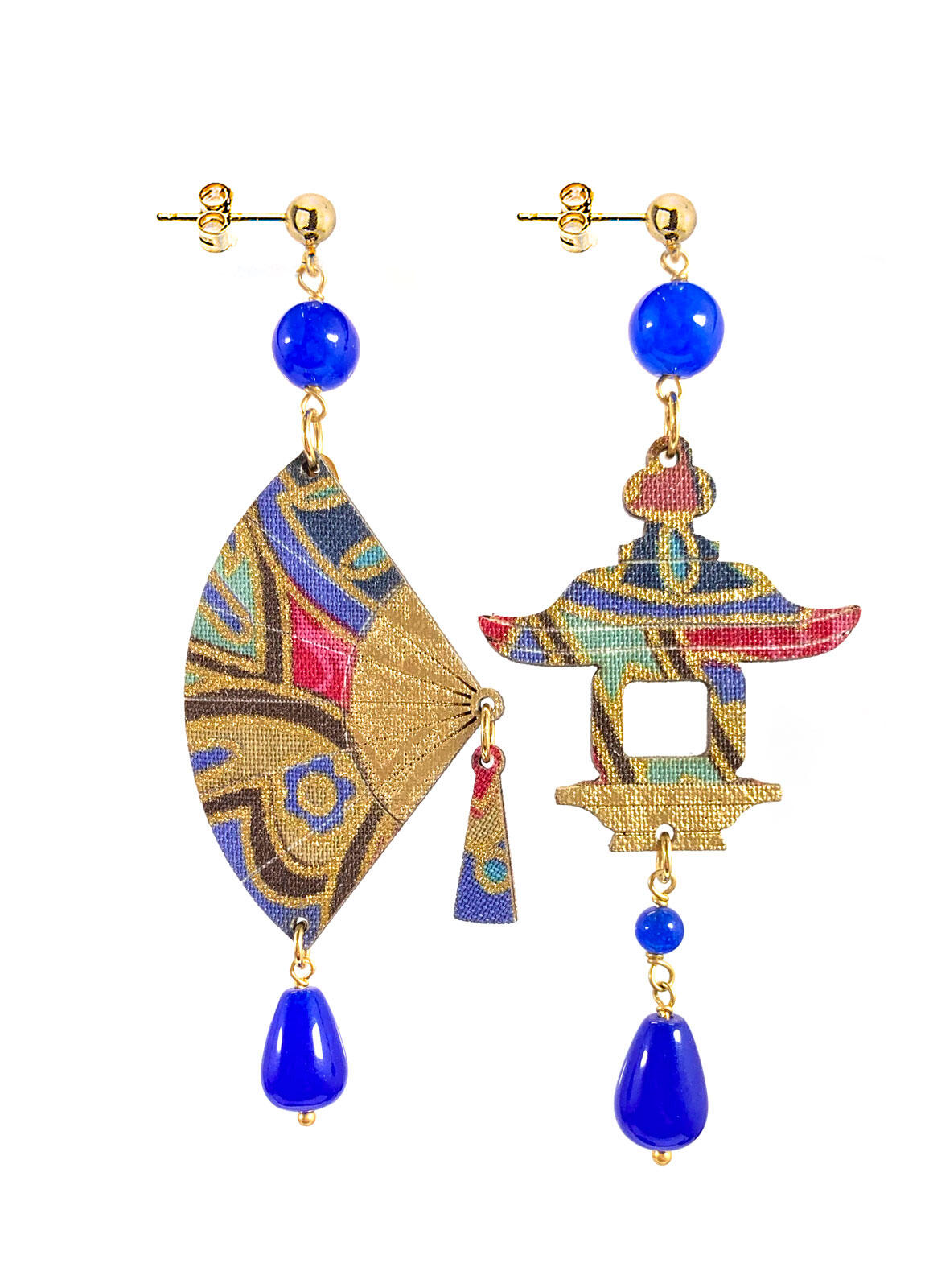 Orecchini realizzati con antichi tessuti di kimono giapponesi stesi con un procedimento particolare su legno. Le pietre che arricchiscono i Ventagli e le Pagode sono tutte pietre naturali montate con elementi in ottone galvanizzato oro. La misura è di 7,5 cm. Made in Italy